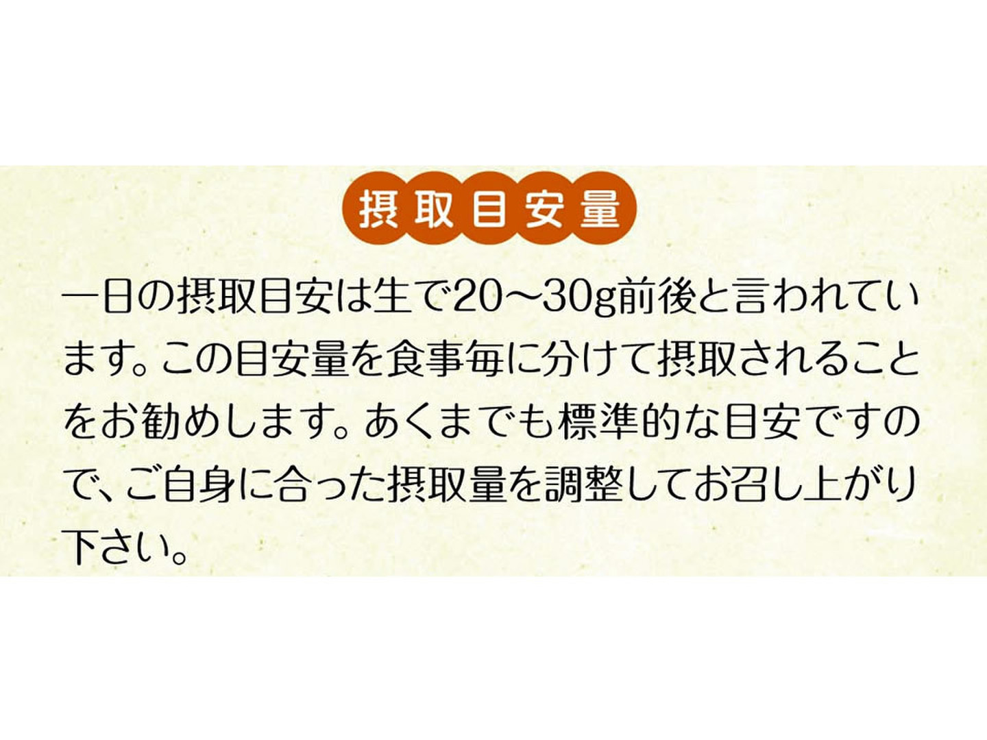 一日の摂取目安は生で20〜30g前後と言われています。この目安量を食事毎に分けて摂取されることをお勧めします。あくまでも標準的な目安ですので、ご自身に合った摂取量を調整してお召し上がり下さい。