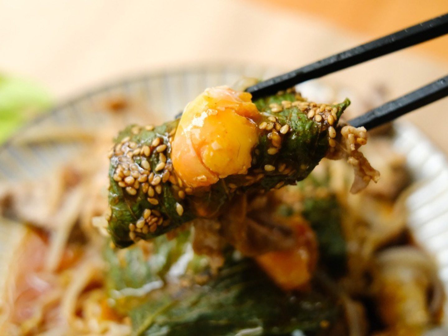 香ばしいえごまの葉を、秘伝の醤油だれでじっくり漬け込みました。