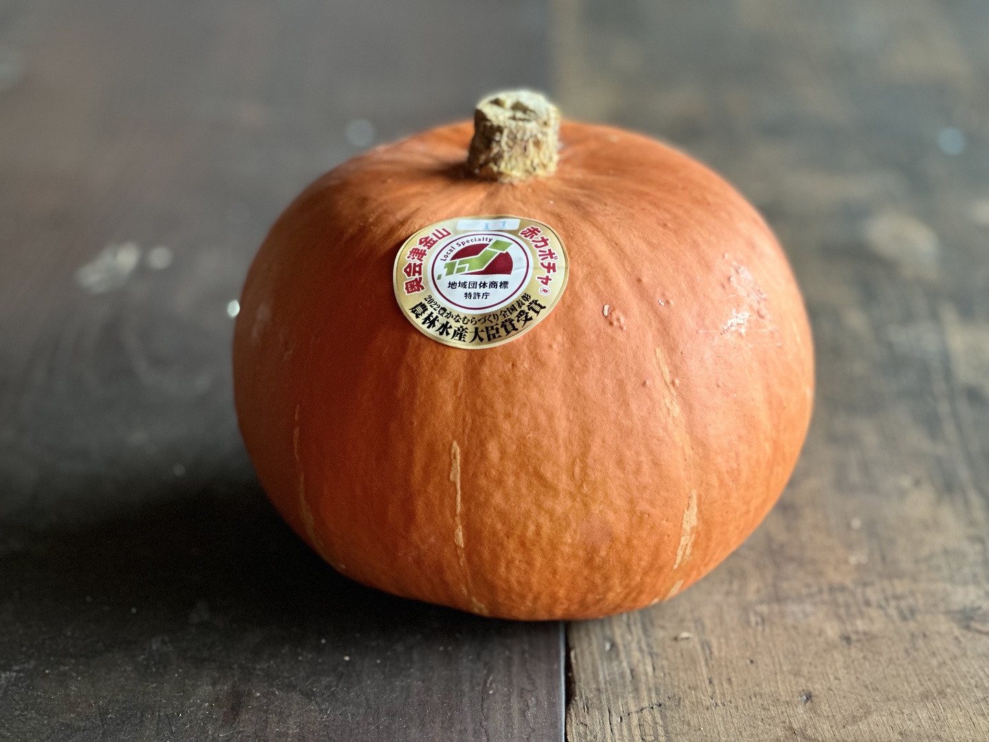 金山町の特産品、「奥会津金山赤カボチャ」は、濃いオレンジ色の皮と、お尻に大きな「へそ」を持つ、甘くてホクホク、薄い皮と強い甘味が特徴のとってもおいしいカボチャです!