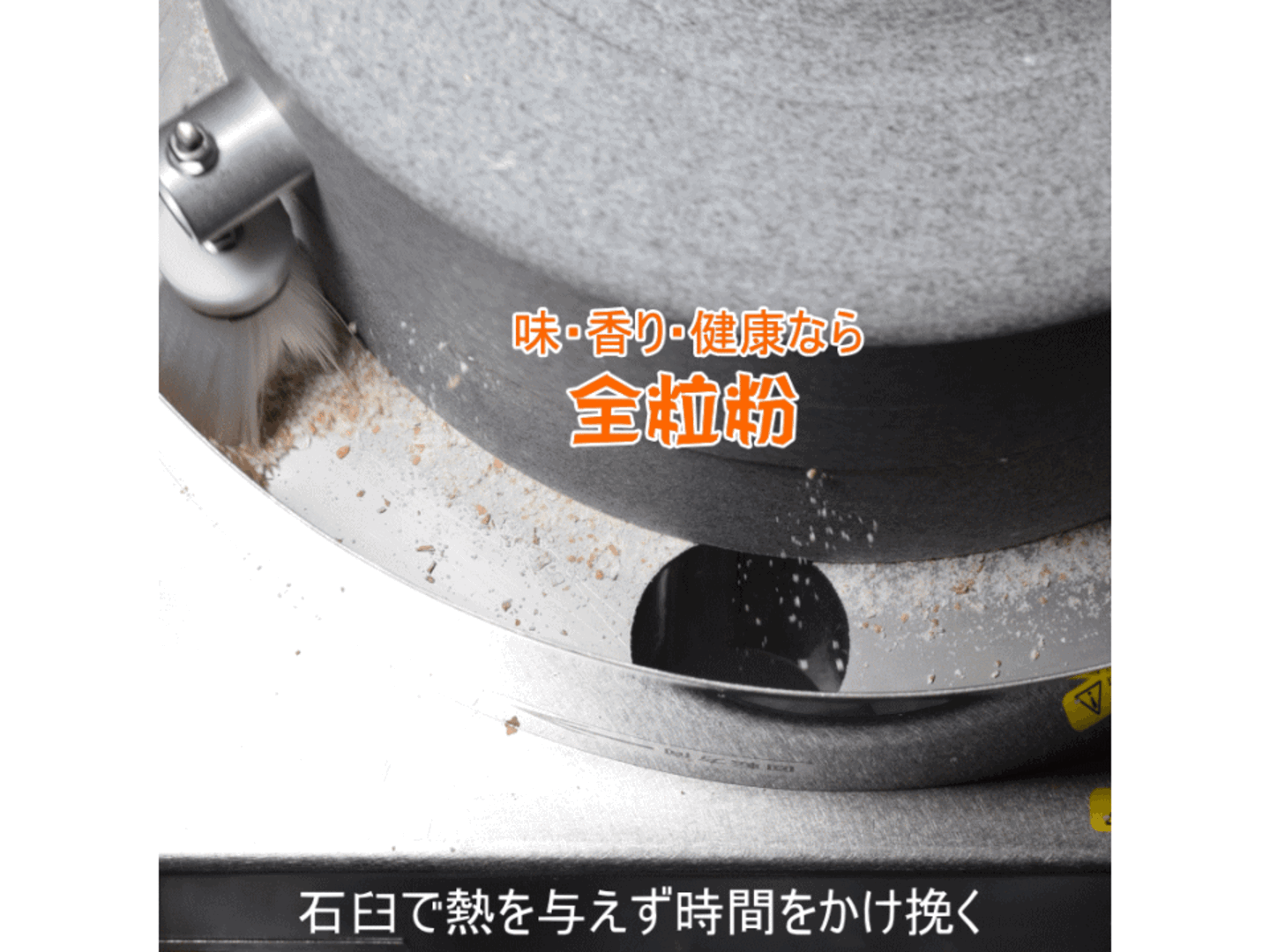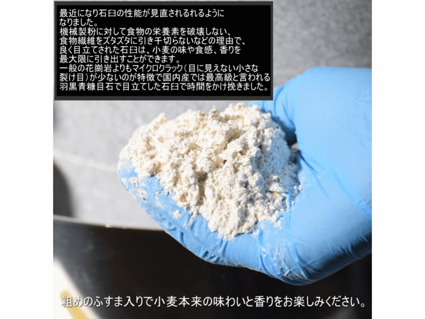 石臼挽きは機械製粉に対して、小麦の味や食感、香りを 最大限に引き出すことができます。 また、食物の栄養素を破壊しない、 食物繊維をズタズタに引き千切らないなどの理由で再注目を集めています。一般の花崗岩よりもマイクロクラック(目に見えない小さな 裂け目)が少ないのが特徴で国内産では最高級と言われる 羽黒青糠目石で目立てした石臼で時間をかけ挽きました。