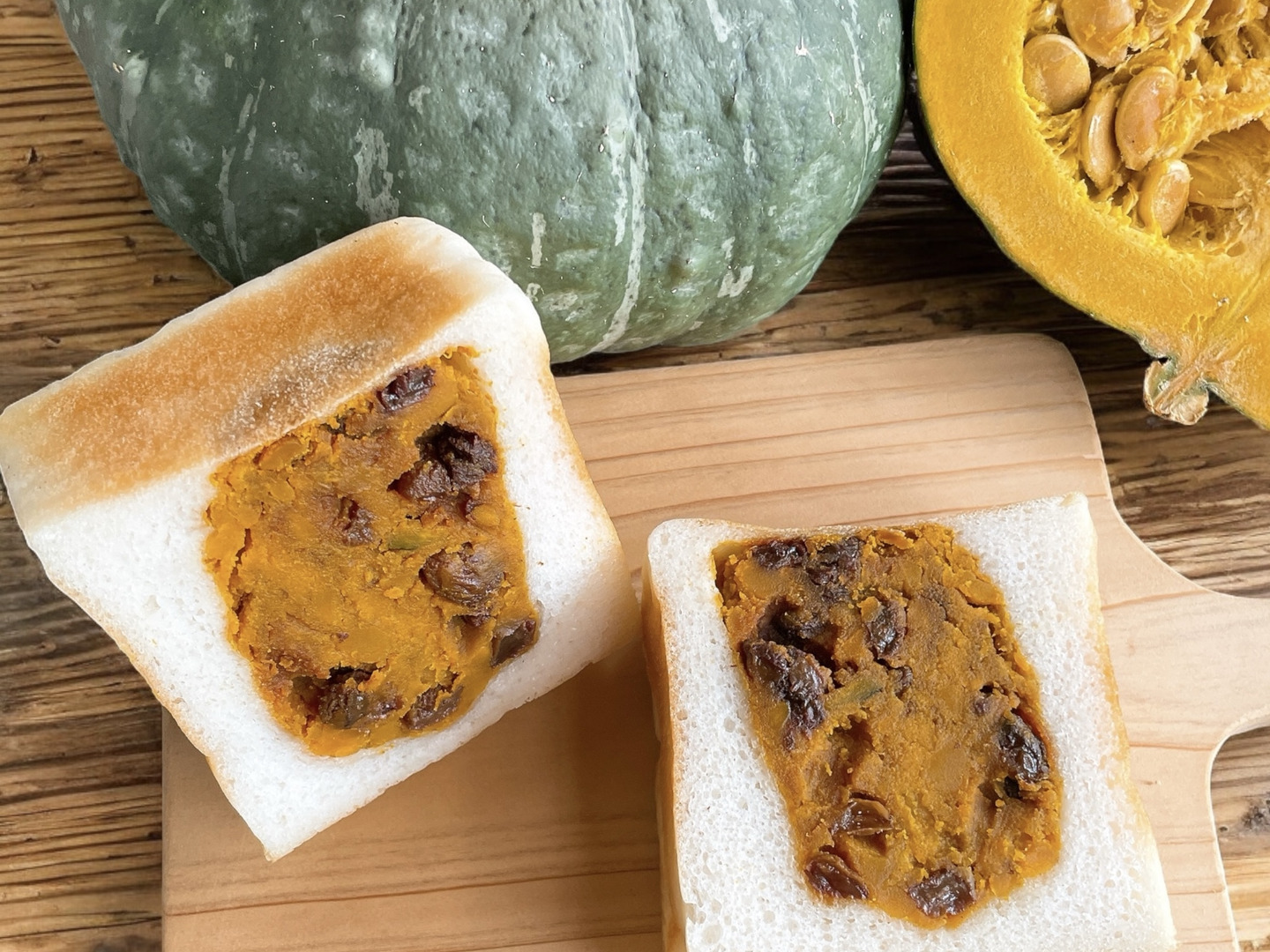 自然栽培パンプキンをスイートパンプキンにして、お米のパンにたっぷりと入れました!