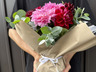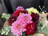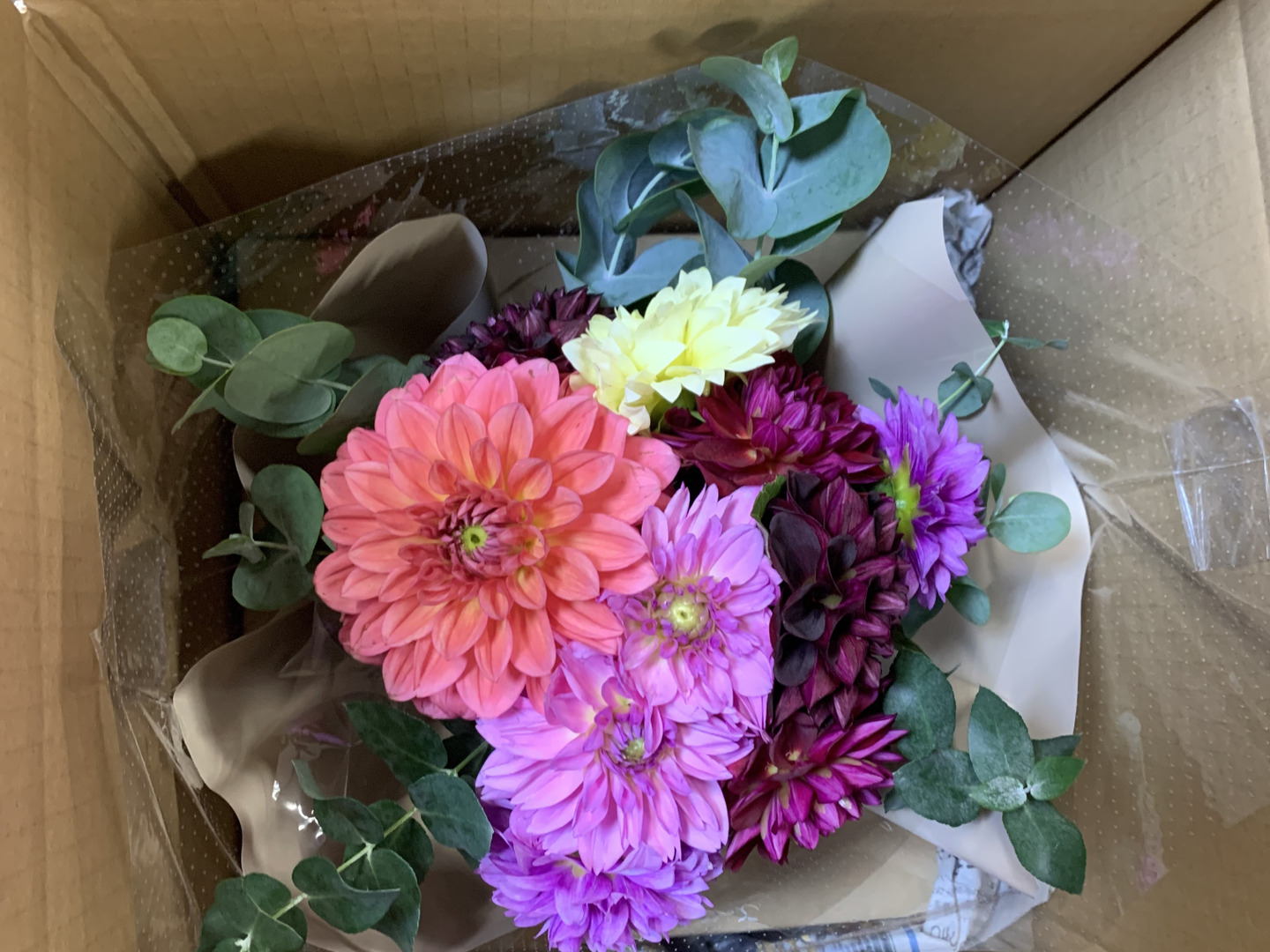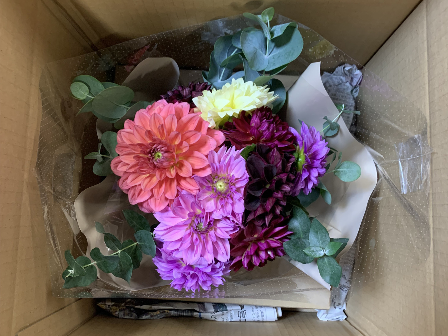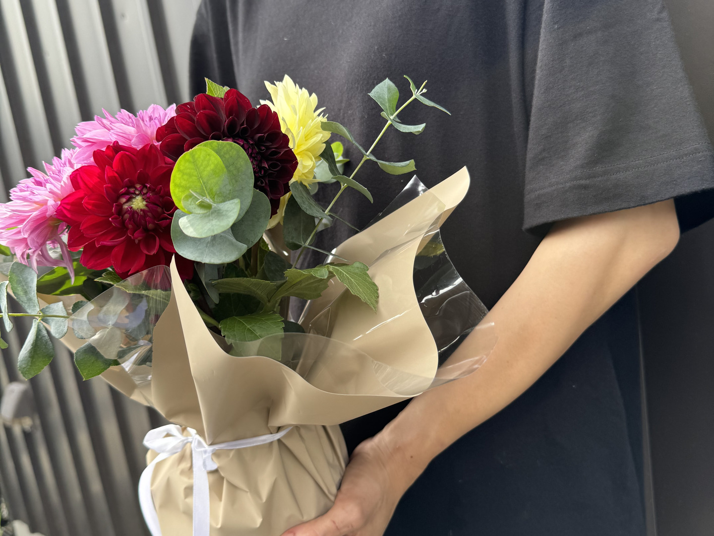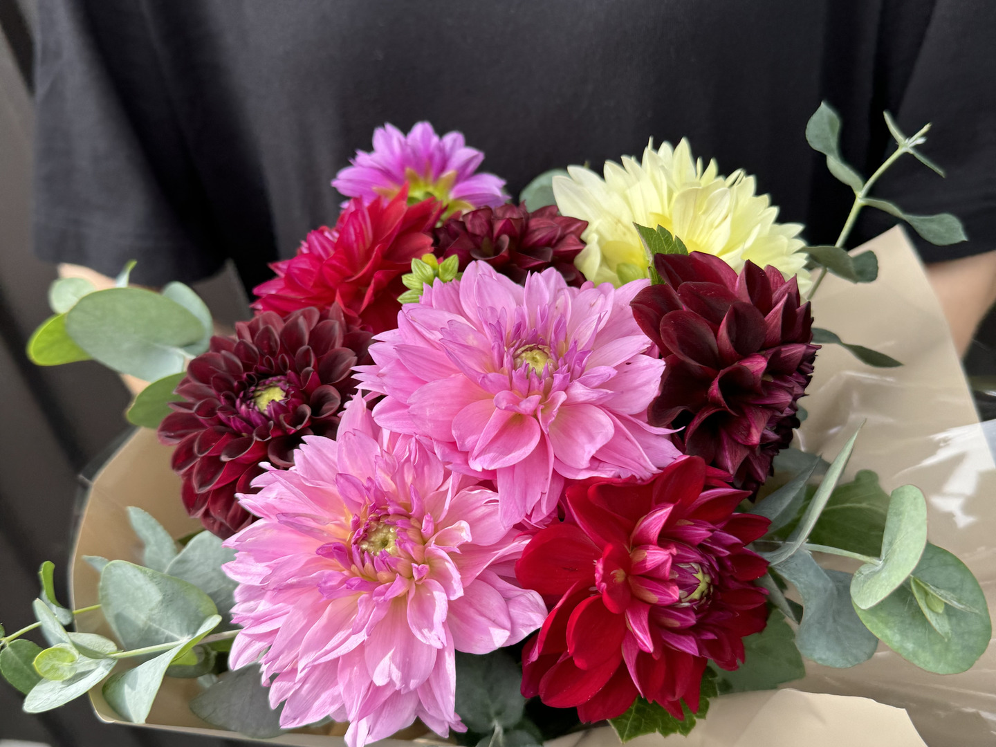日光園藝のおすすめダリアは色とりどりで発色も良く透明感抜群。グリーンのユーカリを取り入れることでシックな印象をプラスし、ハイセンスで上品な花束に仕上げました。花瓶とセット販売になっていますので、プレゼントした後も長くお楽しみいただけます。