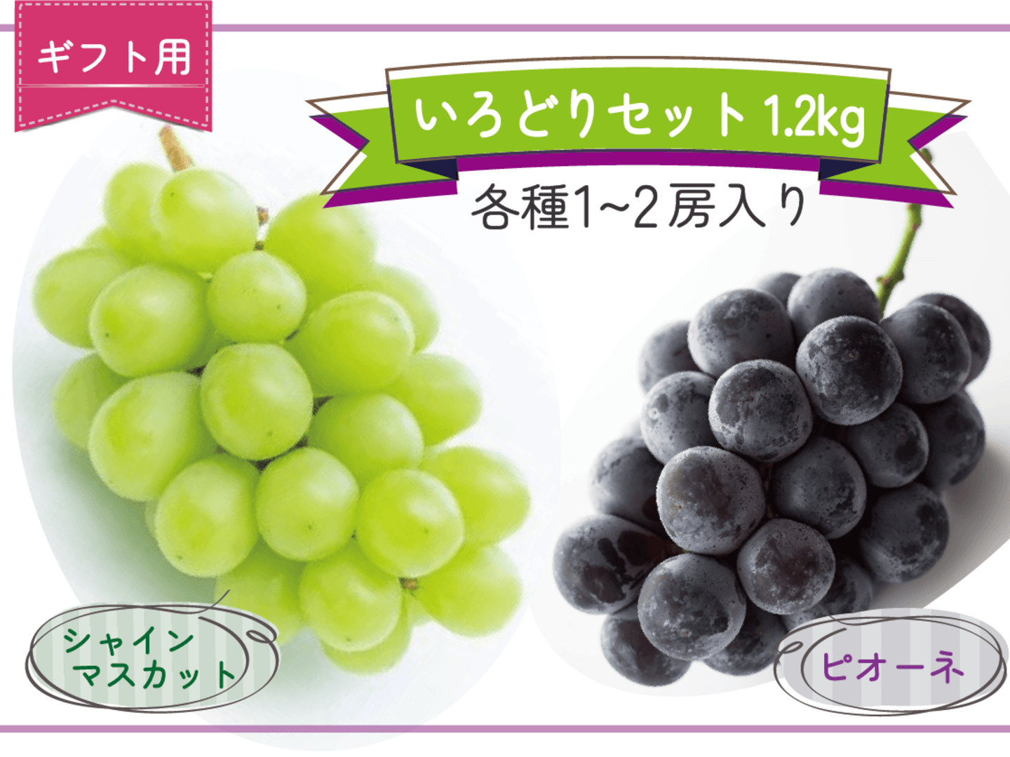 手間暇かけた栽培によって、一つ一つのぶどうを丁寧に育てました。いろどりセットはシャインマスカットとピオーネの魅力を存分に楽しめる贅沢なセットです。