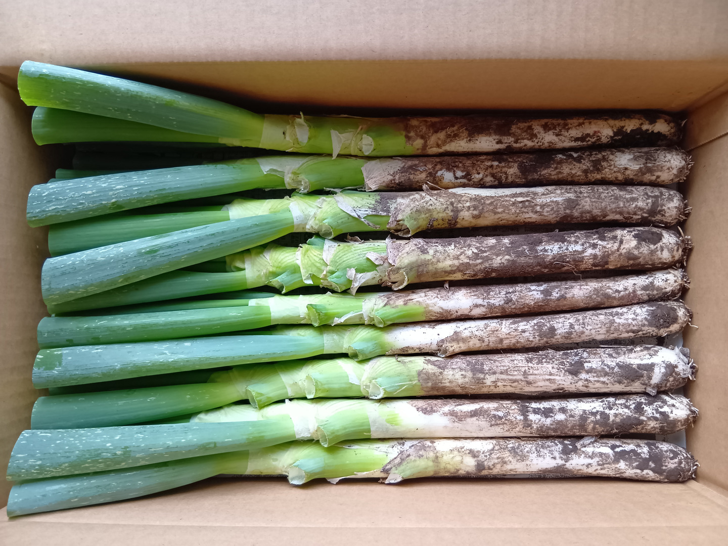 写真は1.5キロ(太いものだけなら8本〜細いのも入ると16本くらい)。3キロは長ネギ2段に重ねます。(太さ色々入ります)