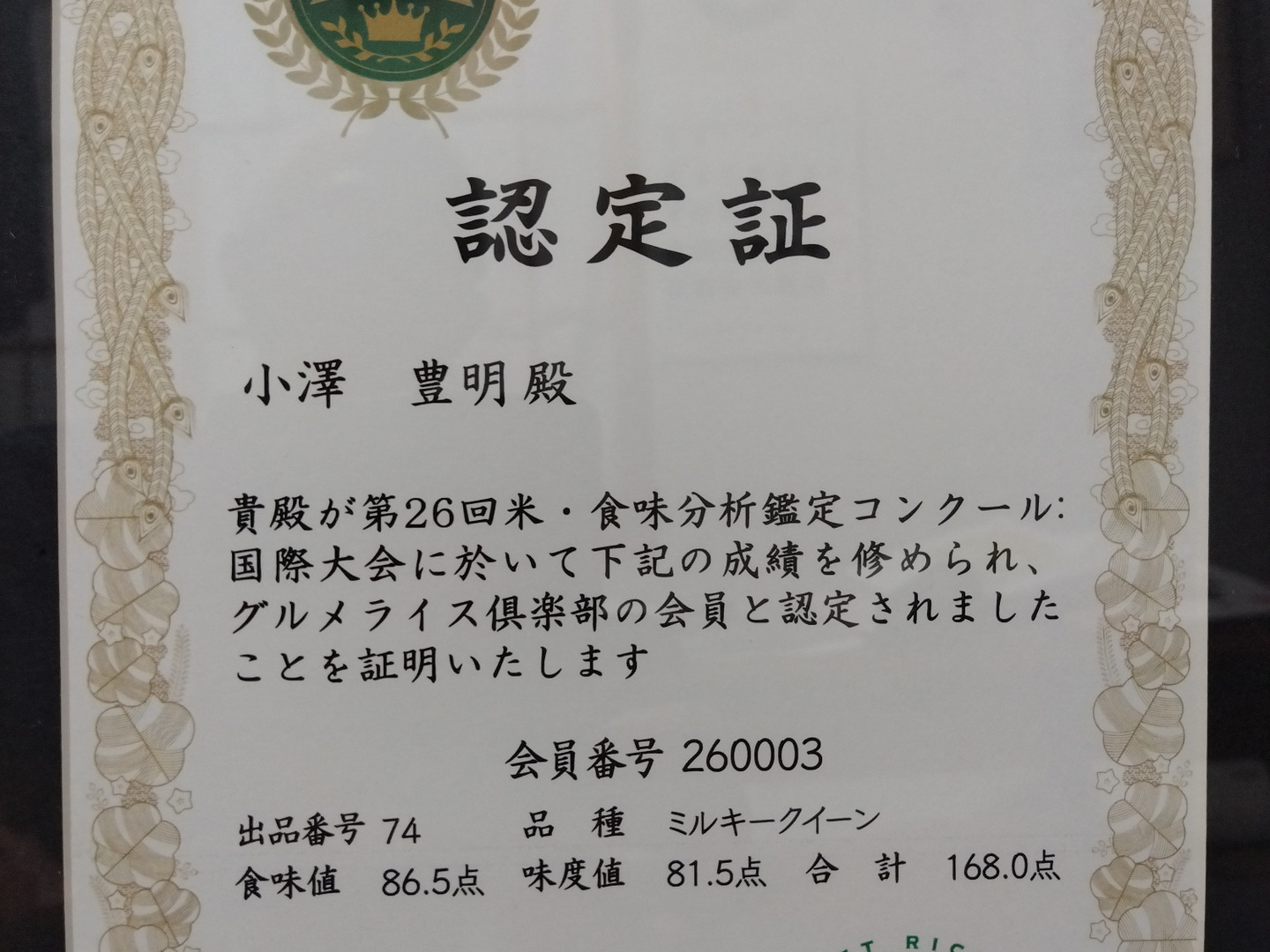 令和6年に米・食味鑑定士協会よりグルメライス倶楽部会員として認定されました