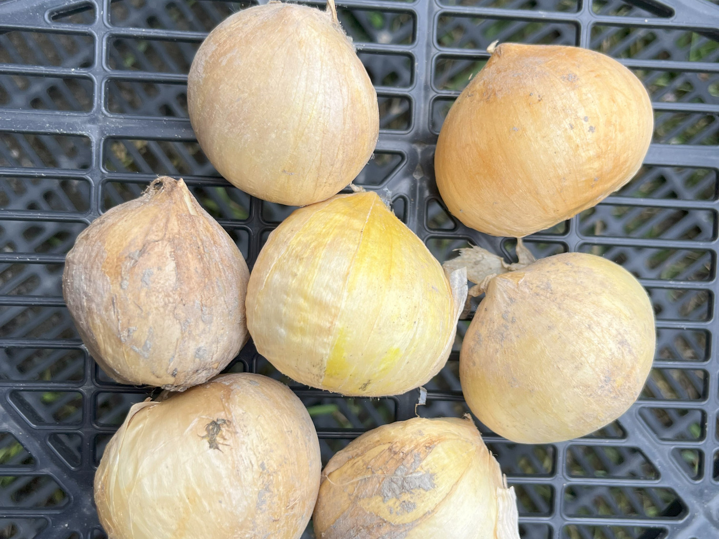 今が食べごろ、黒ニンニクなどの加工に適した時期です。9月からはシーズン終盤です。大きさは鶏卵半分くらいのものからやや小さめまでのサイズです。収穫期に雨が降ったため、土付きの商品が多くなっています。