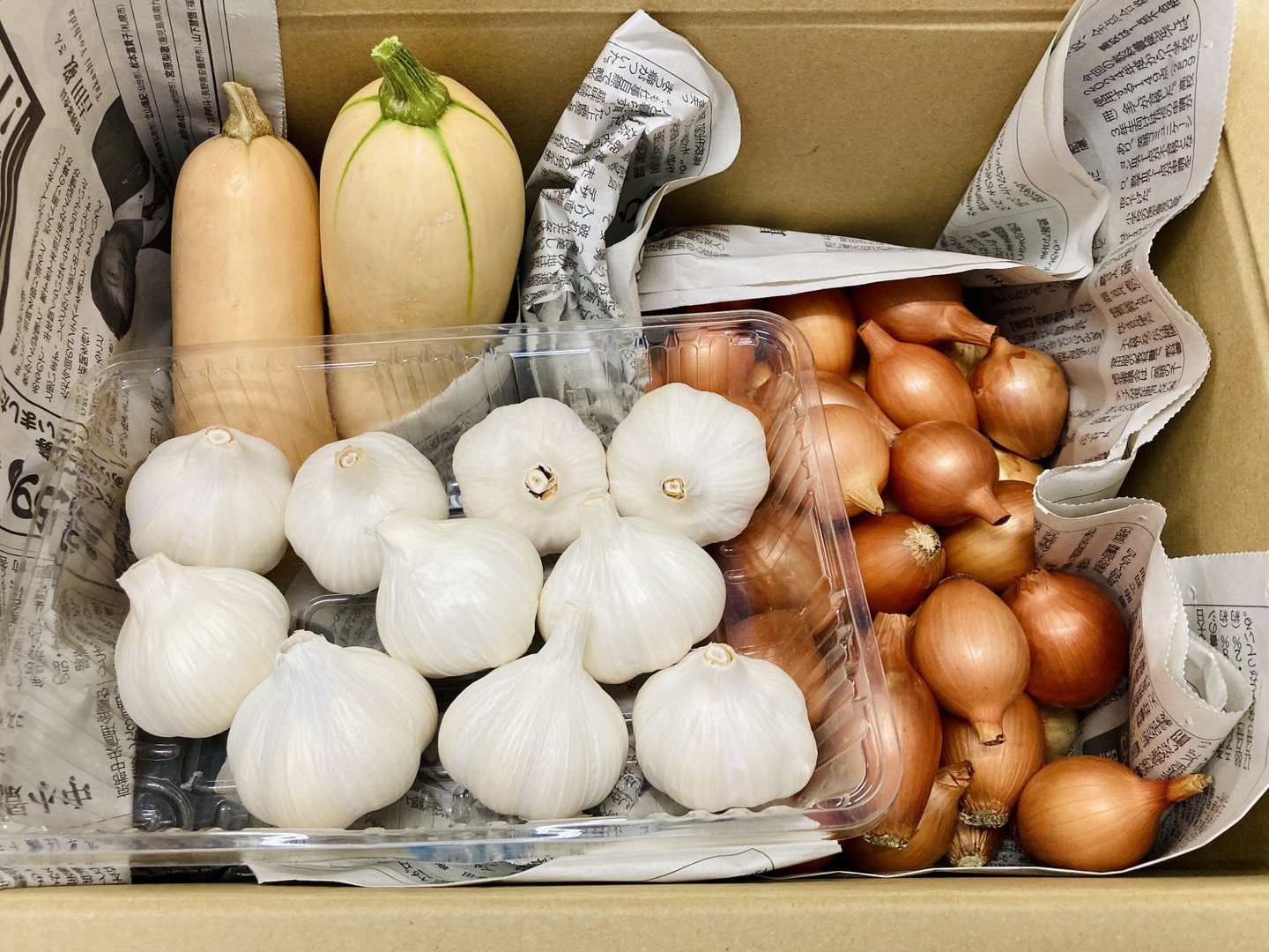バターナッツ約800gと小ぶり玉ねぎ約1.5キロ、にんにくホワイト六片10個のセットです。