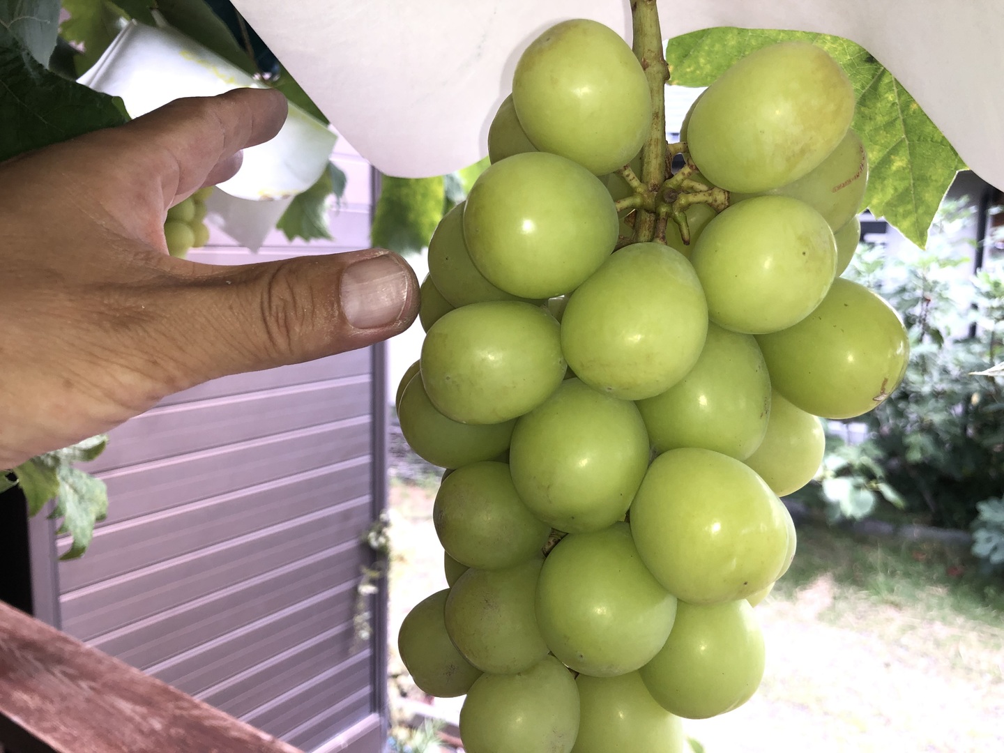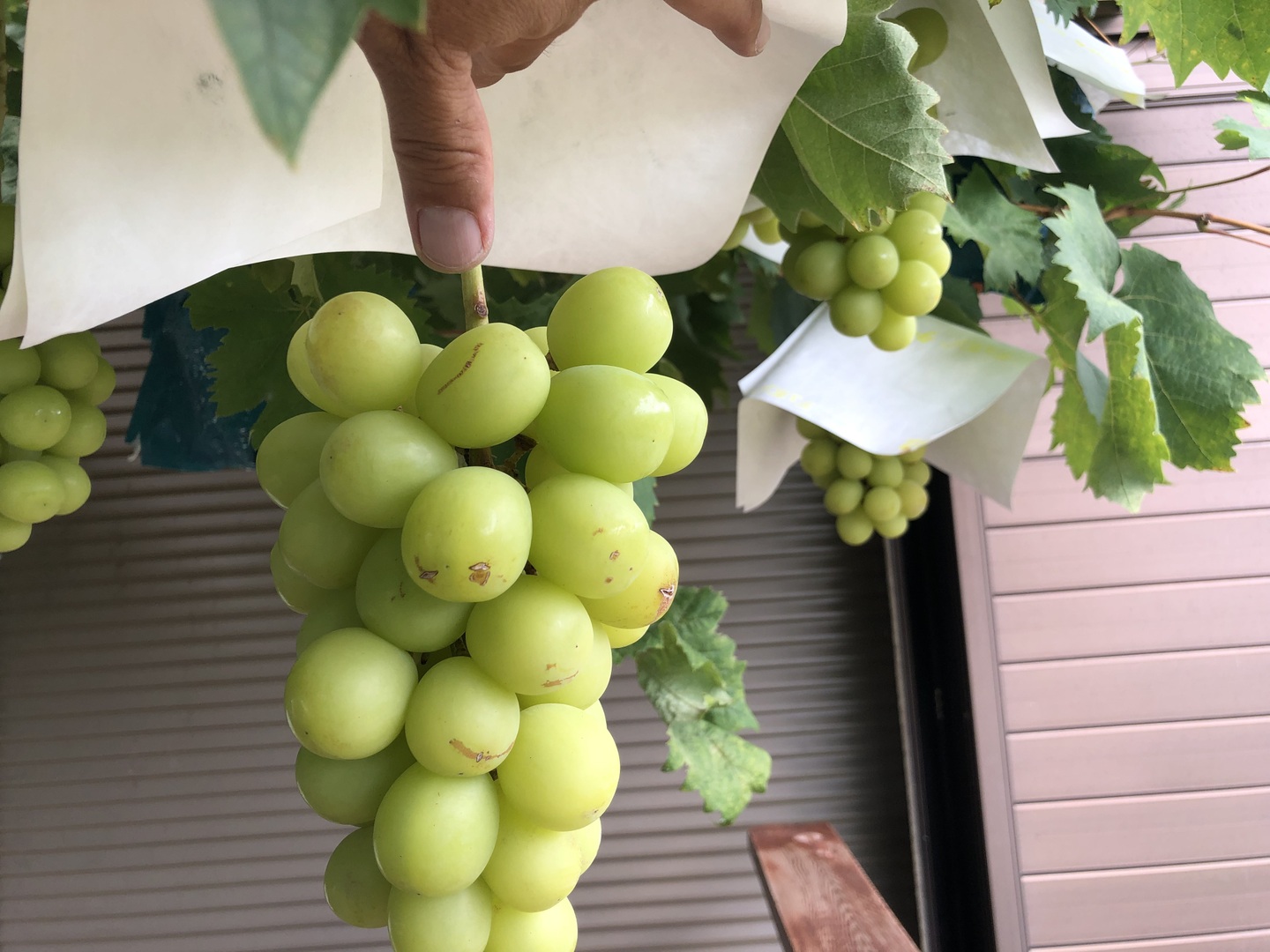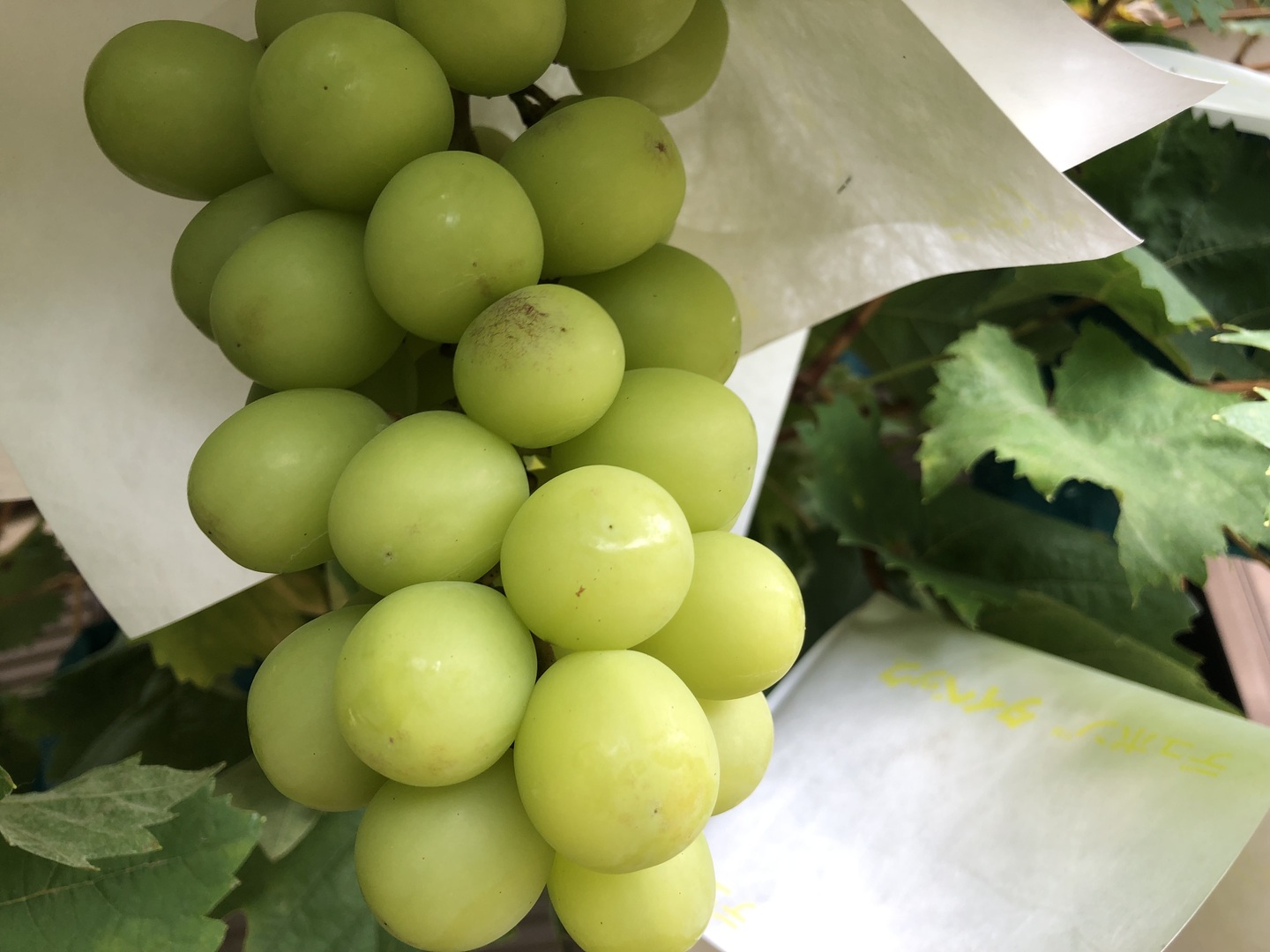 ここまで『奇跡のシャインマスカット』として殺菌剤、殺虫剤不使用だった当シャインマスカットですが、今年はうどん粉病で全滅しかけたので化学合成殺菌剤を1成分使用しました。それでも栽培期間中の化学合成殺菌剤使用成分数たったの『1』で山梨県慣行栽培削減対象化学合成農薬成分数の『28』と比べると96%の削減です!