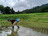 除草機を押して田んぼを歩き、手作業で除草しています。