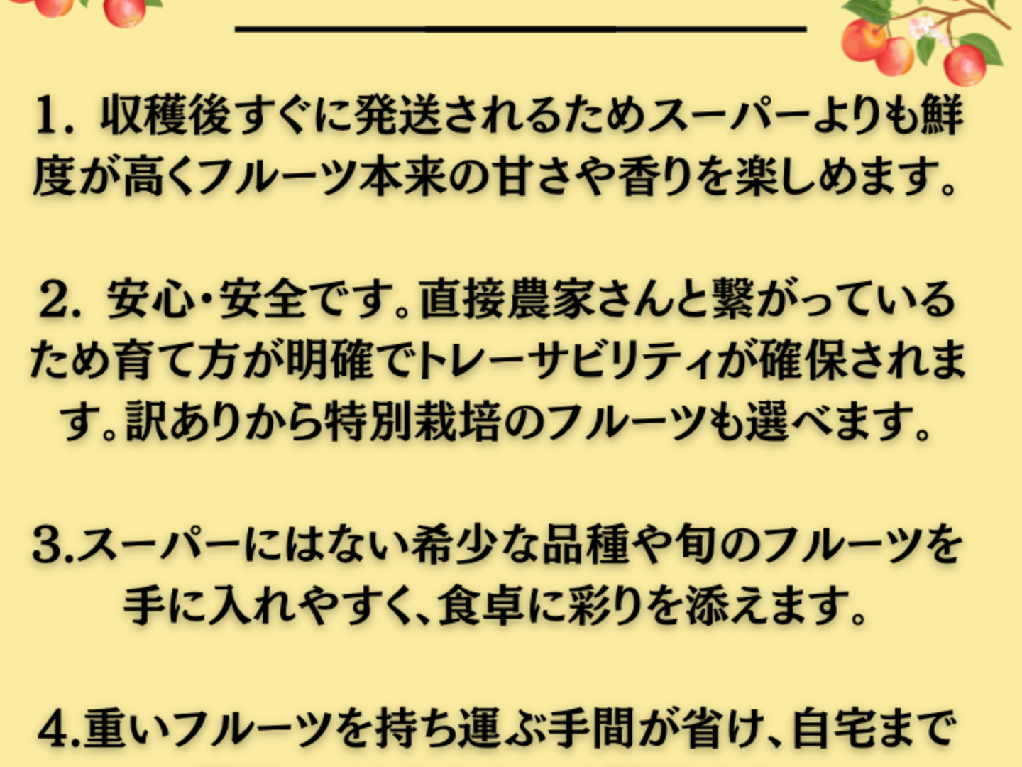 - もぎたて直送の果物