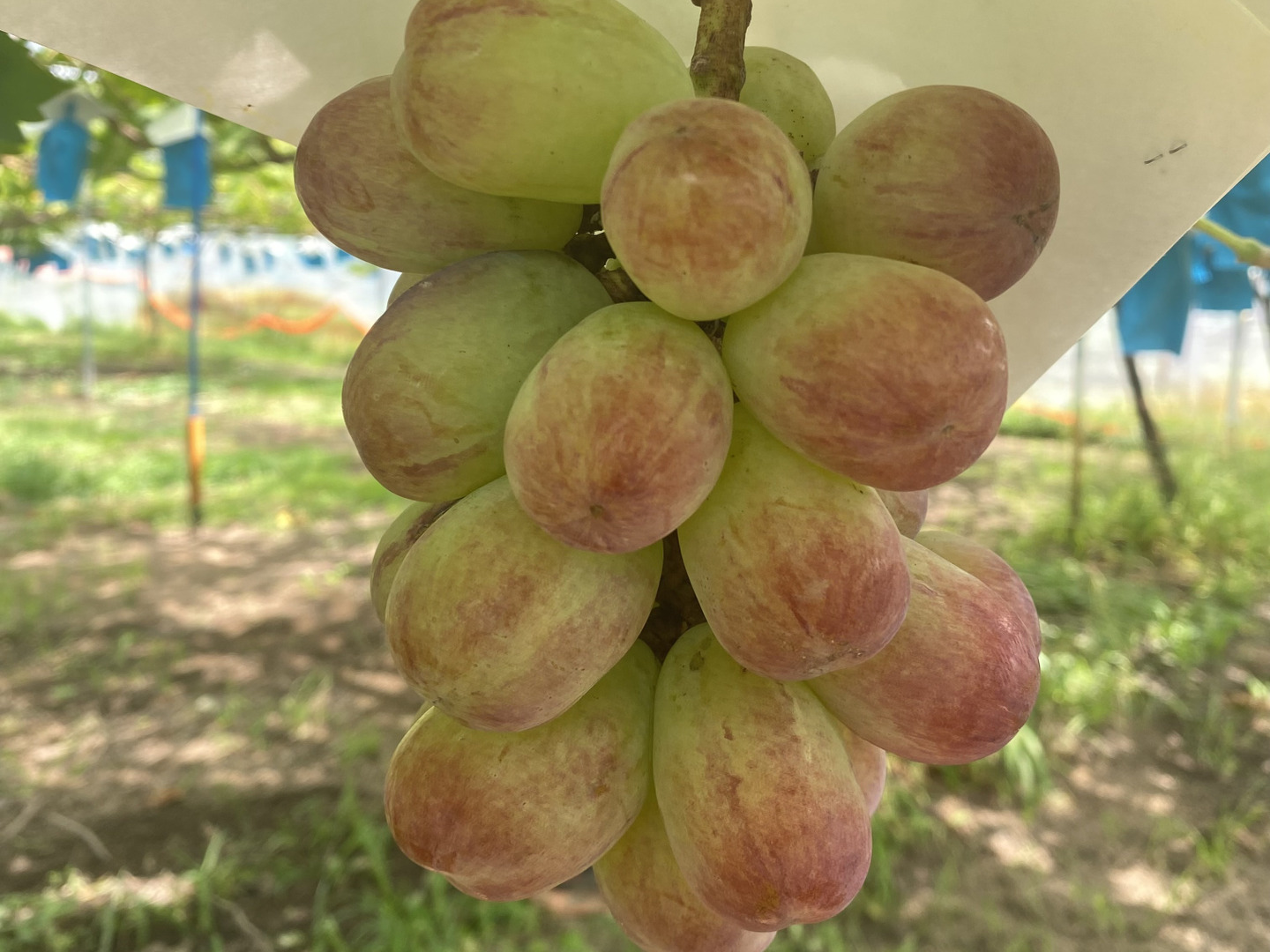 シャインマスカットを親にもつ、次世代レア新品種。大きいもので1房1キロにもなるドスコイぶどう。見た目に反し、酸味と甘味のバランスがよく、食べる手がとまらなくなる。