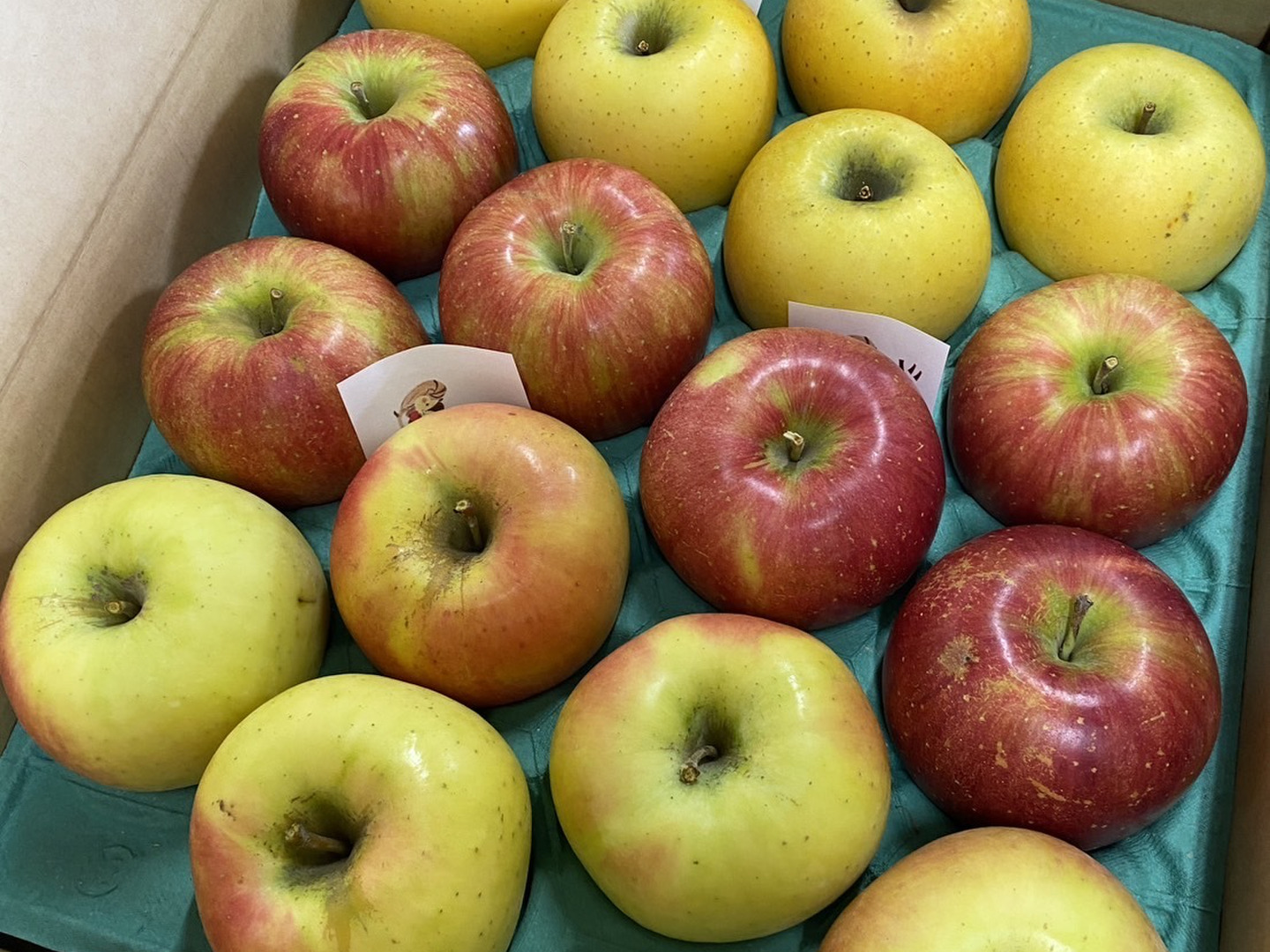 こちらの商品は「12玉〜20玉」という、箱によってりんごの数にばらつきがあります。12玉のりんごはかなり大きめ、20玉だとちょっと小さめ。けれどこの個数(大きさ)をお客様でご指定いただくことはお断りしております……。
