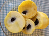 ポポーはとても傷みやすい性質をもっていて変色しやすくお届けの際には部分的に黒くなったりしておりますが皮をむけば中身は綺麗な黄色をしております。
