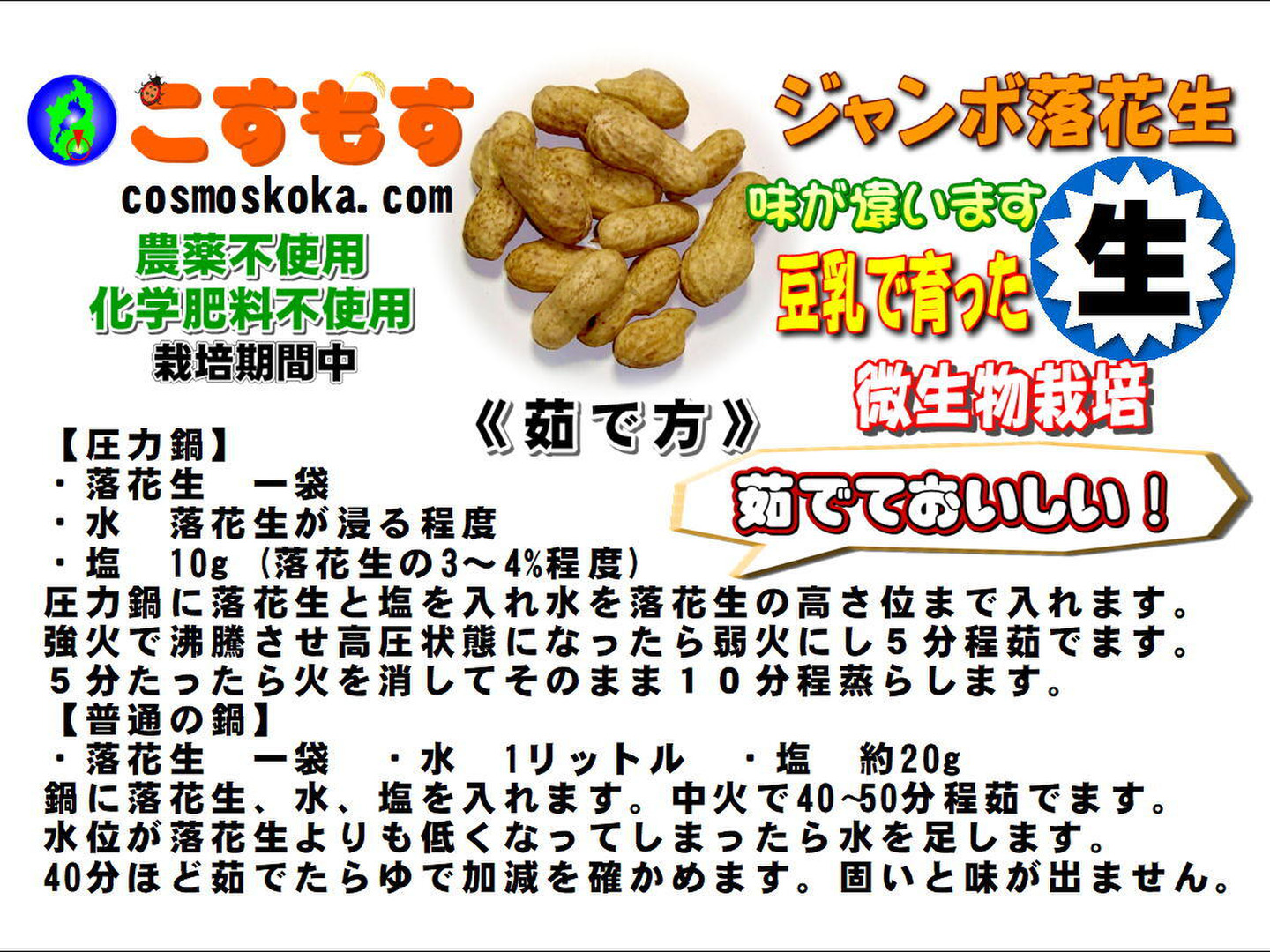 - 豆乳で育った甘みのあるおいしい落花生です。