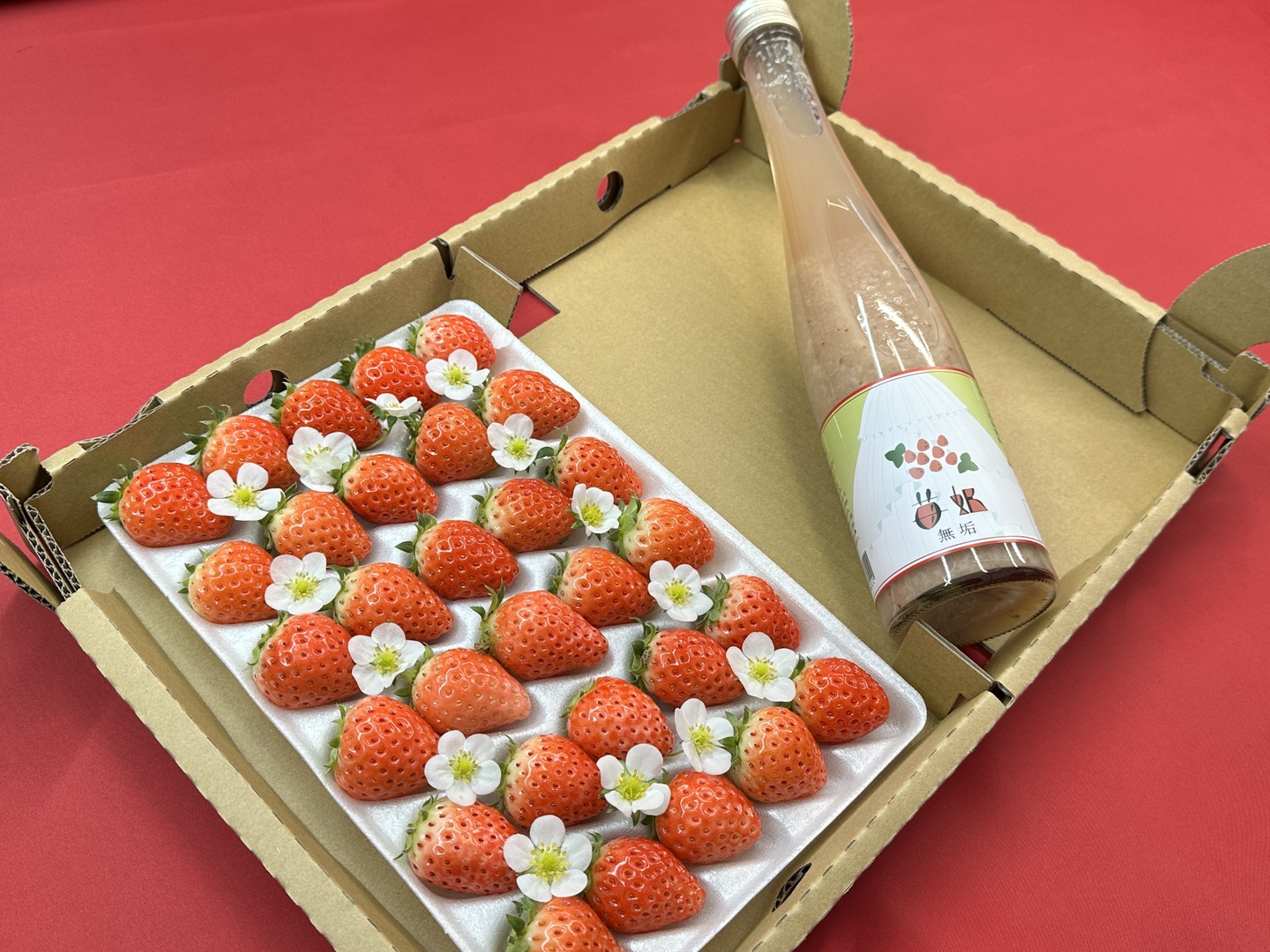 ①夏秋イチゴ。30粒入り x1トレー(稀に20粒や24粒になる場合があります) ②イチゴ甘酒300mL x1本のセット。