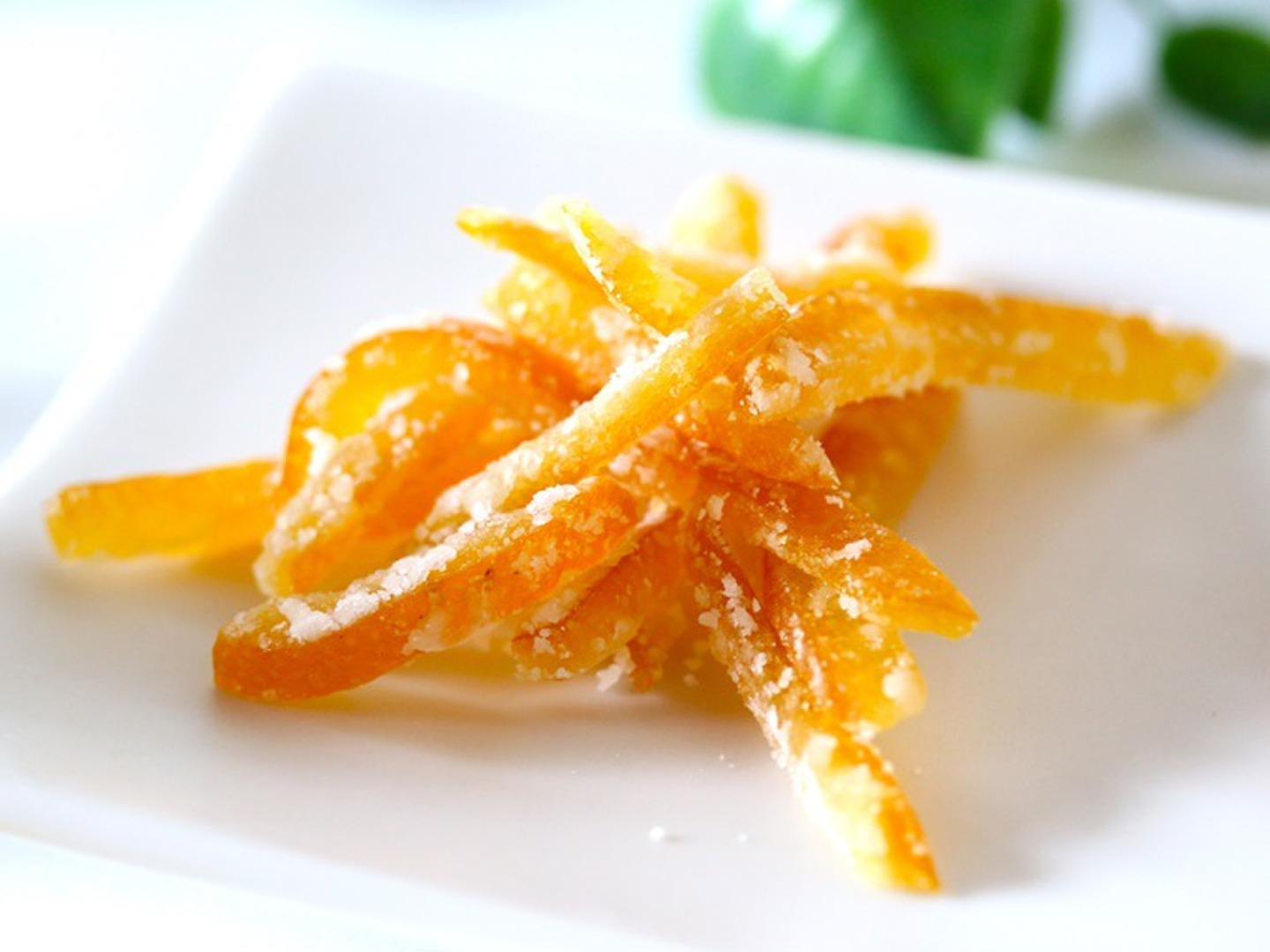 手作業で、皮だけで食べておいしい状態 fruit Confit (フリュイコンフィ)にじっくり時間をかけ仕上げてから、低温で乾燥しました。