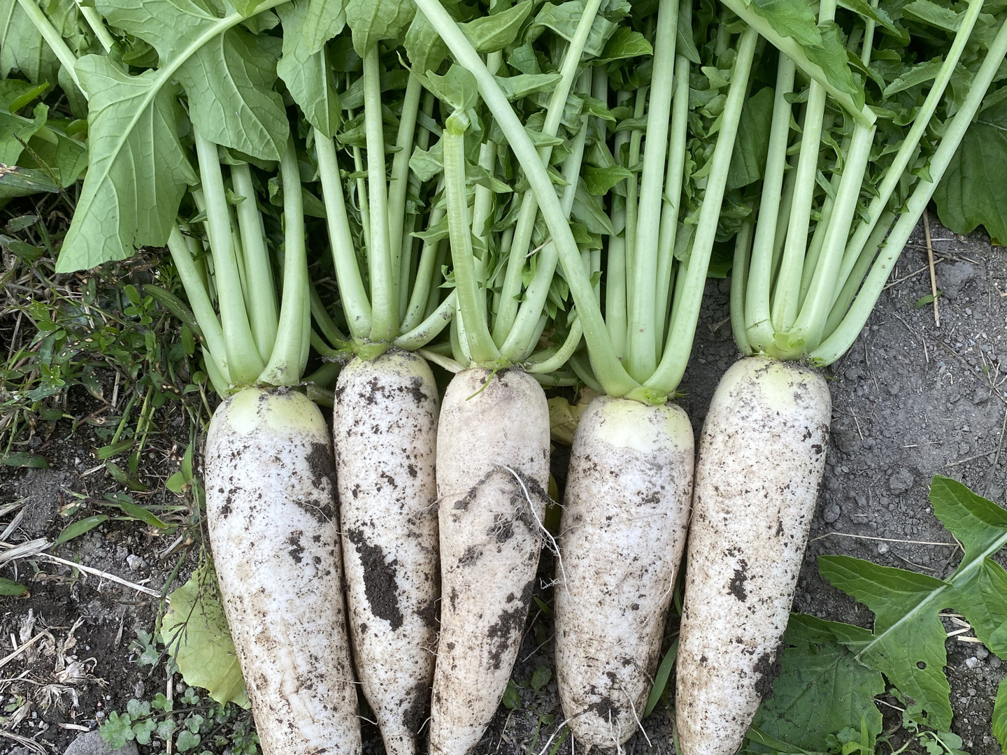 止まらないおいしさ…やめられない大根! 農薬不使用だから葉付き大根と里芋セット!カリカリ!ぽりぽりっ!