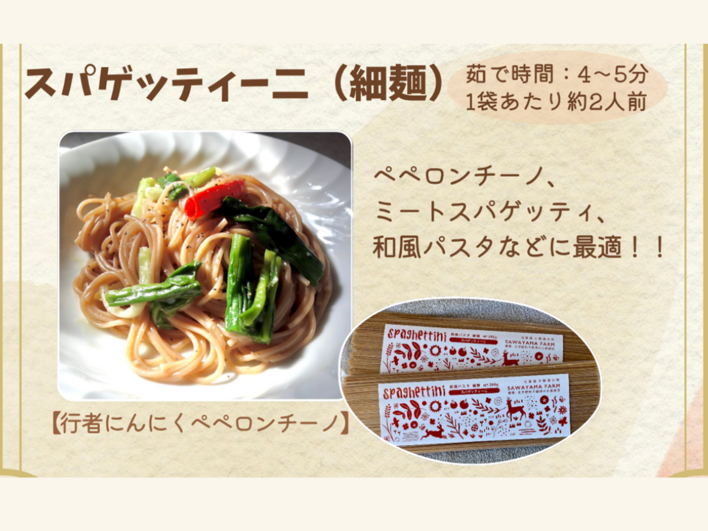 細麺は、トマトパスタ、ミートスパゲッティ、和風パスタなどに最適!!