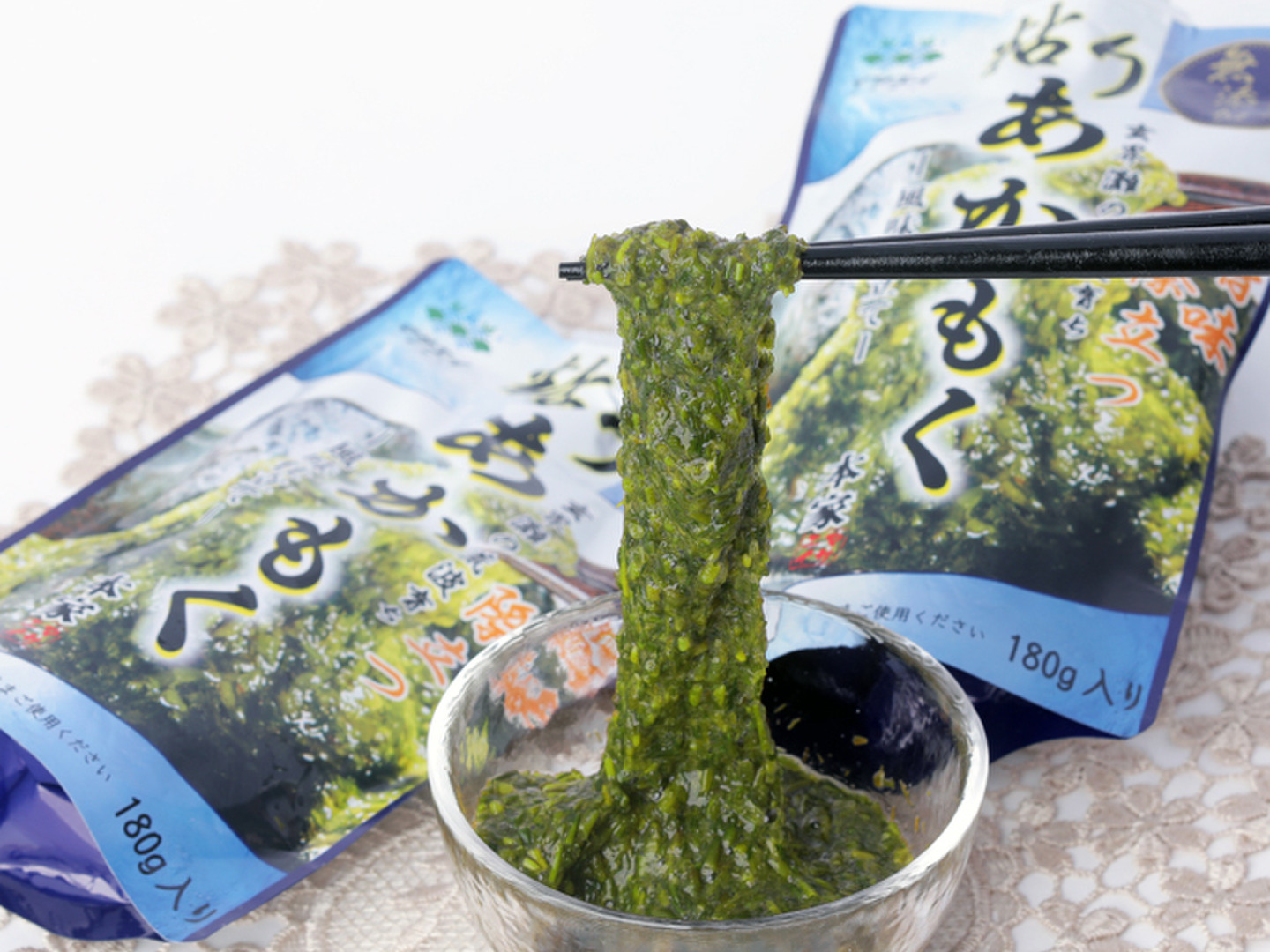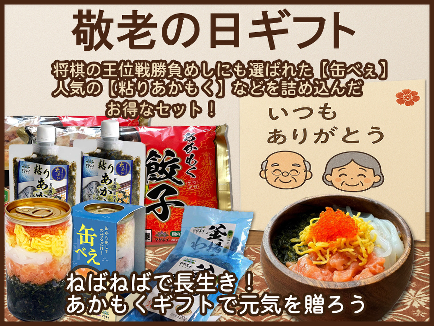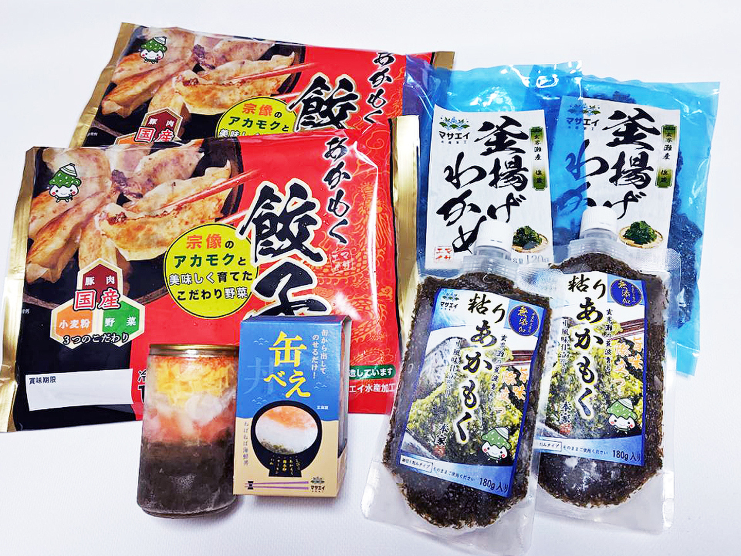| 内容 | 缶べぇ(180g×2)、あかもく餃子(16個入り×2)、粘りあかもく(180g×2)、塩蔵わかめ(120g×2) | ||||||
