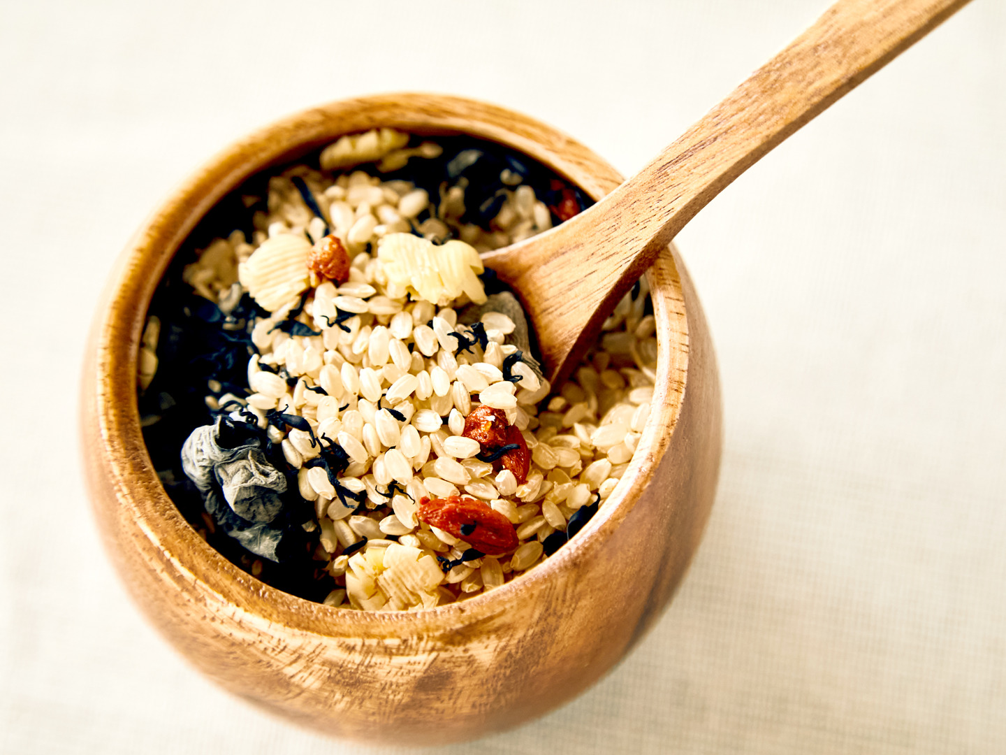 大豆のイソフラボンと薬膳食材にも使われるクコの実でキレイをサポートし、新潟の海水由来の塩が加わることでまろやかな風味の玄米ごはんをお楽しみいただけます。