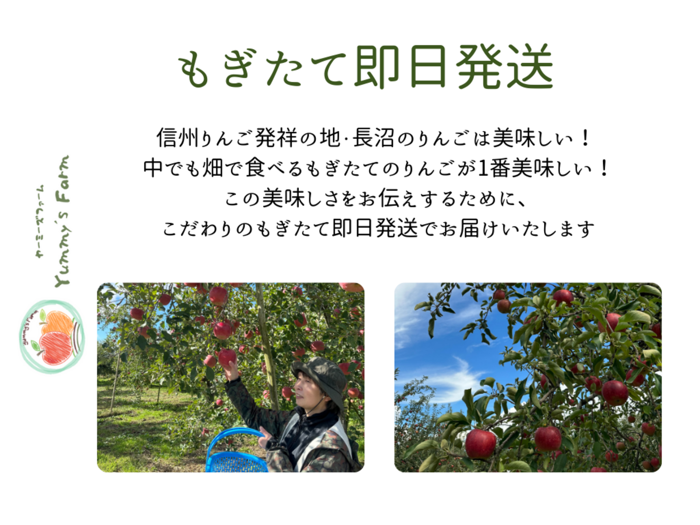寒暖差が大きく雨量が少ない果樹栽培に適した長野市長沼地区のりんごはシャキッとした歯ごたえで甘味と酸味のバランスが良く美味しく仕上がります。