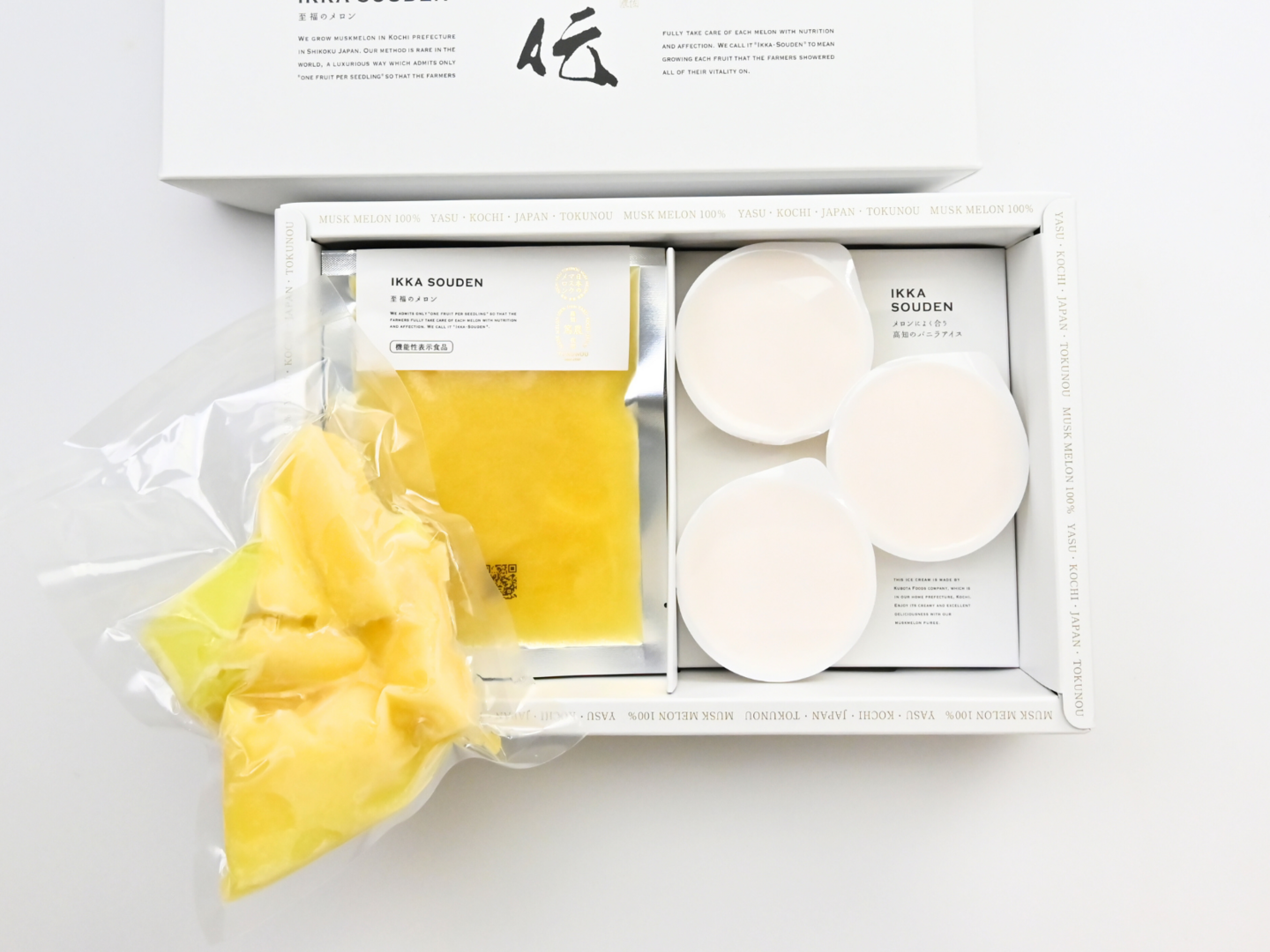 | 内容 | 完熟マスクメロンピューレ120g ×3 袋 + メロンによく合う高知のバニラアイス 80ml × 3個、ジュースのもと165g×1袋 | ||||||