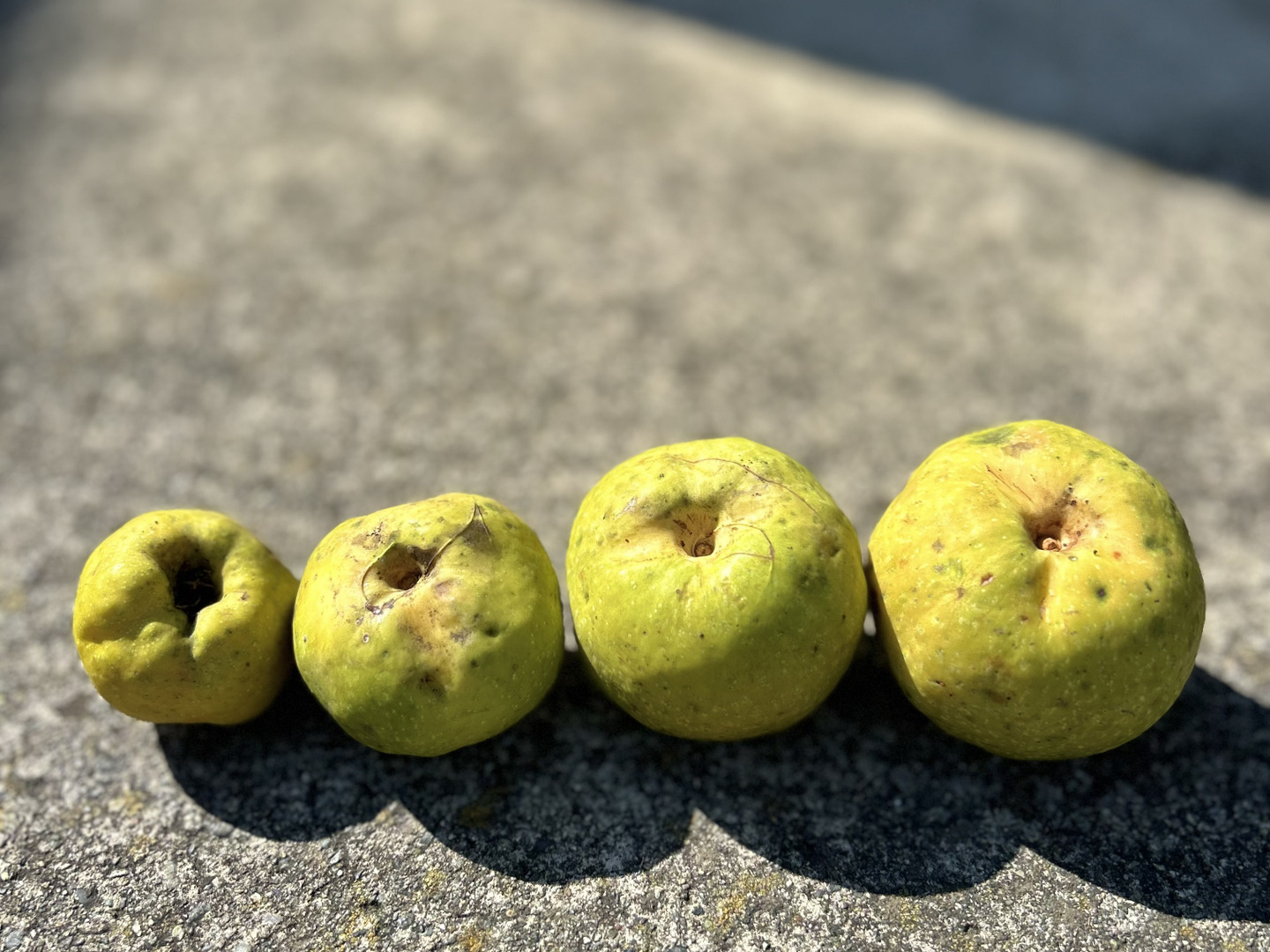 木瓜の実の染色体は通常2倍体ですが、突然変異で4倍体になった稀少な実を育てています。そのため、山や庭先になっている通常の木瓜の実とは異なり、拳1~2個分程度のサイズにもなる大きな実になります。また、カリンやマルメロに似ていると言われるのですが、葉、花、実、香りなど全く別の果実になります。