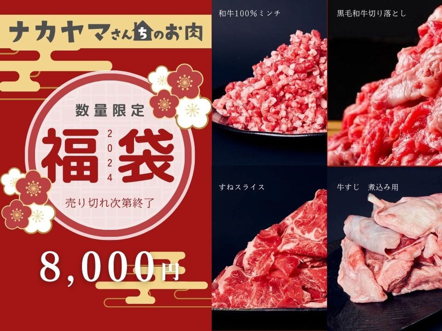 ナカヤマさんちのお肉 8,000円福袋 ご家庭の味をさらにおいしく! 和牛切り落とし肉 400gすねスライス 400g 和牛100%ミンチ 500g 牛すじ 500g 豪華1.8㎏ 大容量福袋
