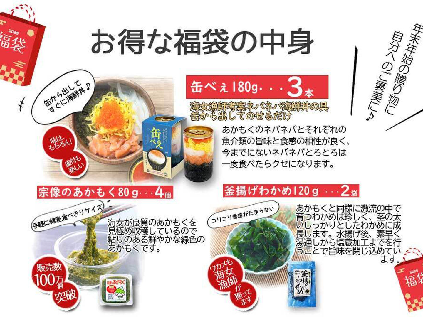 - 缶べぇだけでもお得!さらにアカモクやわかめも入った福袋です。