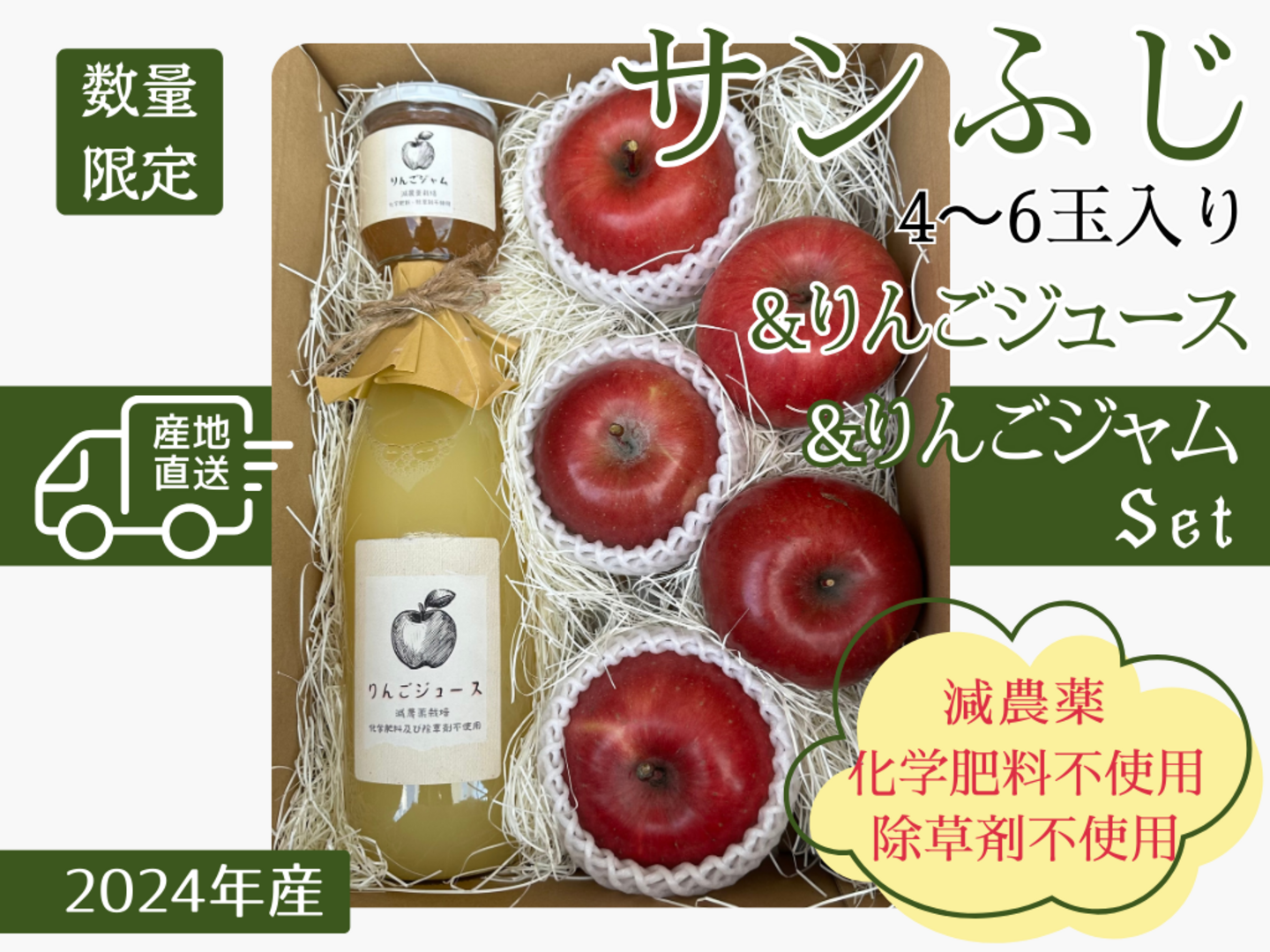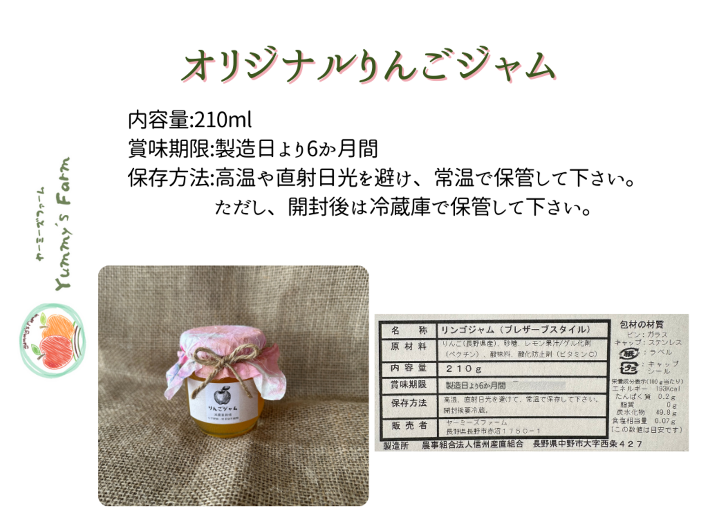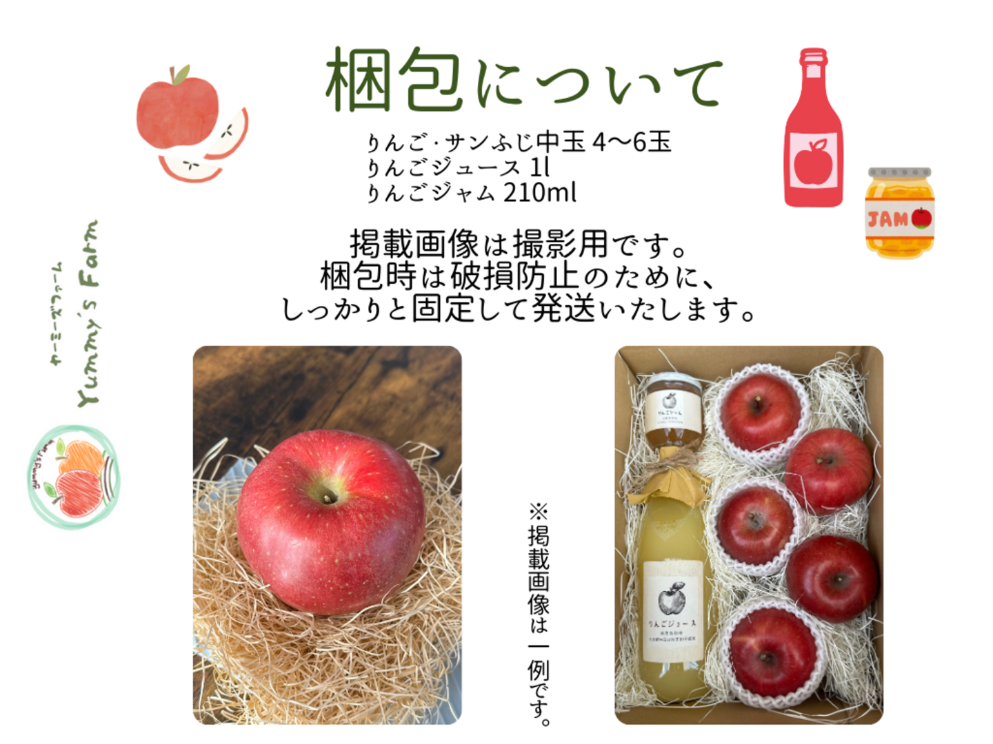 2025年産サンふじで作った当園オリジナルしぼりたてりんごジュース1リットル1本とりんごジャム210ミリリットル1本のセット商品です。