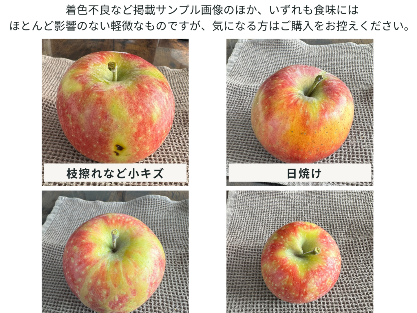 サイズ不揃いや着色不良のほか、枝スレなどの小キズ、サビ、日焼け、変形果など軽微なもので生食にはほとんど影響ございません。