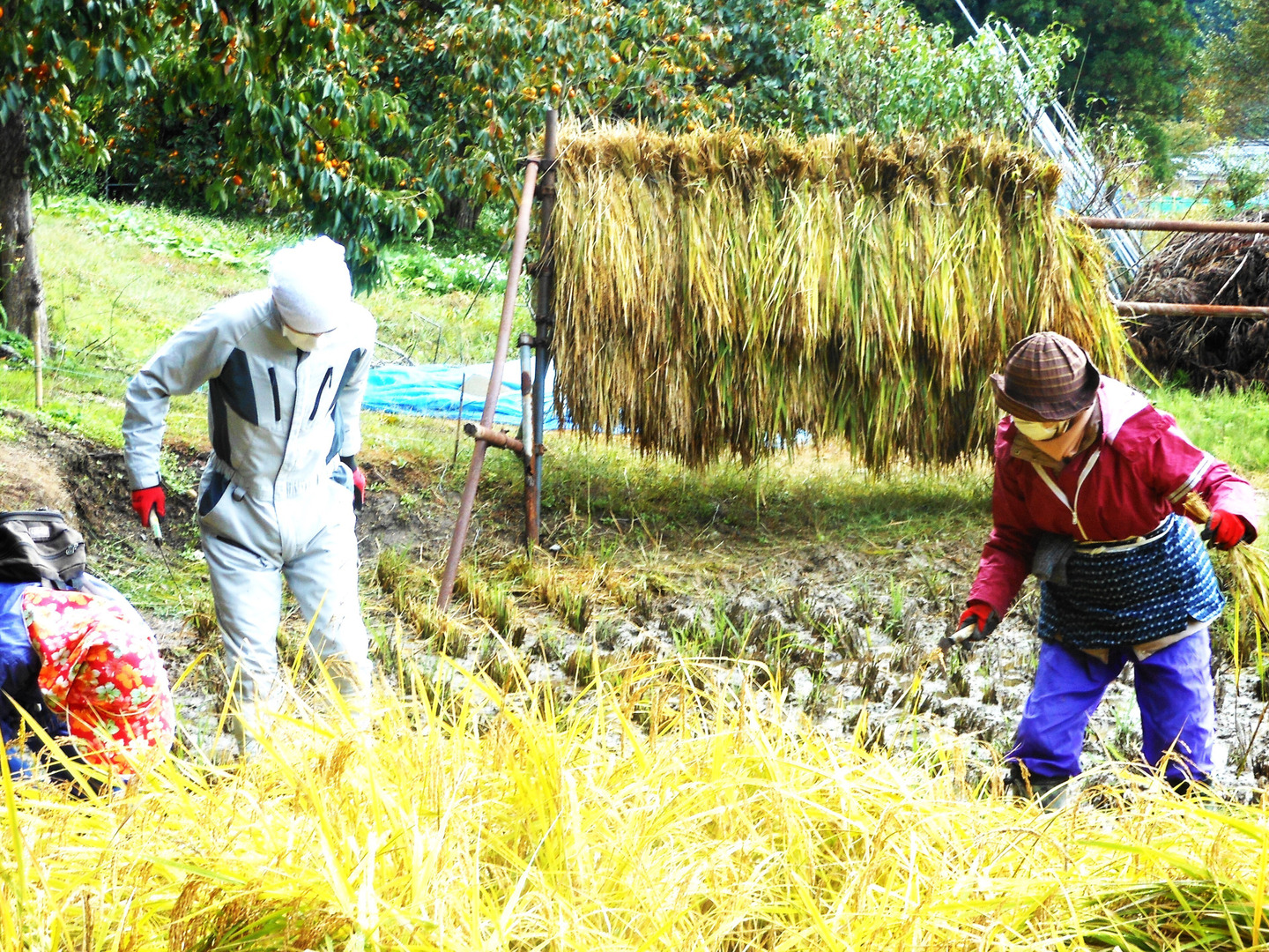 - 1 このお米を食べていただき、皆様との、良き、田舎暮らしの百姓と、ご縁が有りますように、【縁結びの田んぼで雨天が続き手刈りをしている風景】