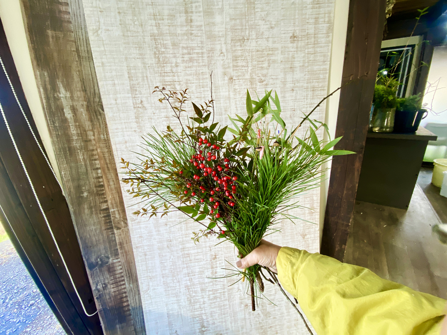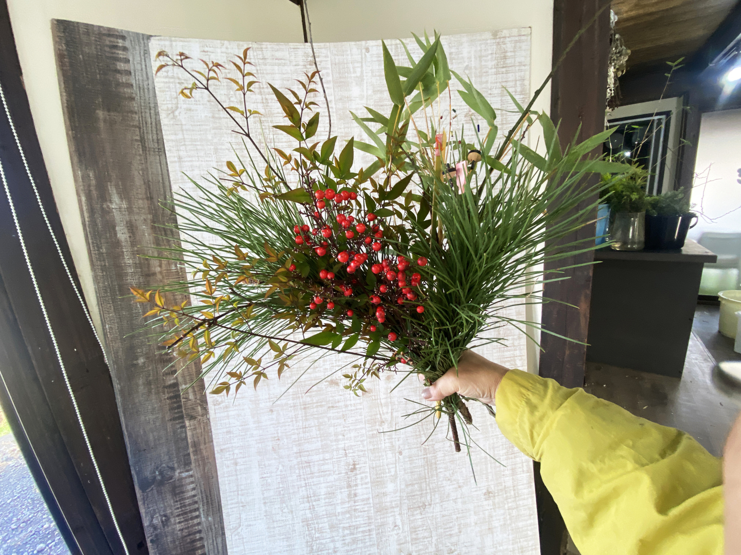 新年を迎えるのにぴったりな、松・竹・梅、稲穂、南天を組み合わせた豪華な正月用の花材。