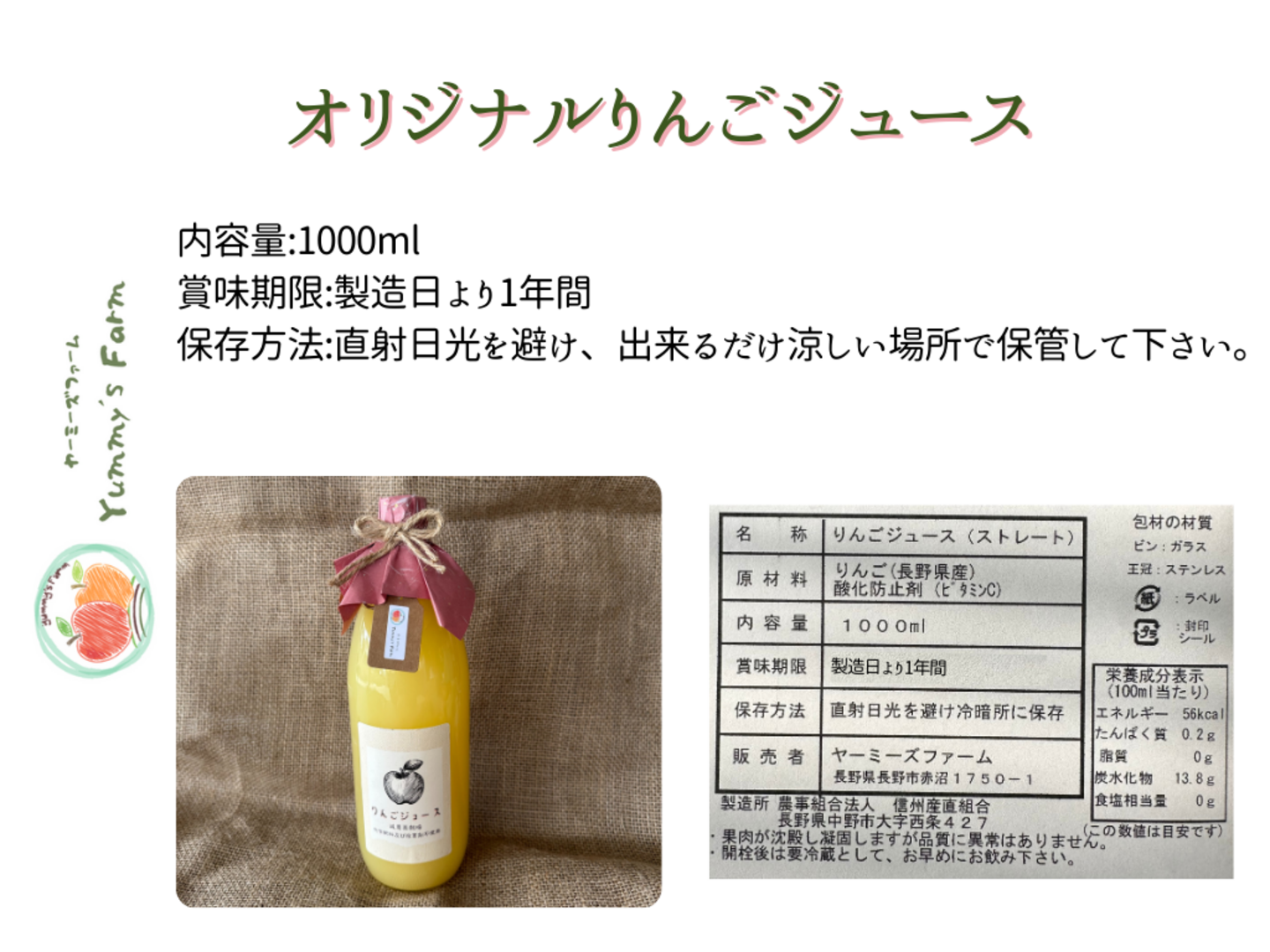 2025年産サンふじで作った当園オリジナルしぼりたてりんごジュース1リットル1本とりんごジャム210ミリリットル1本のセット商品です。