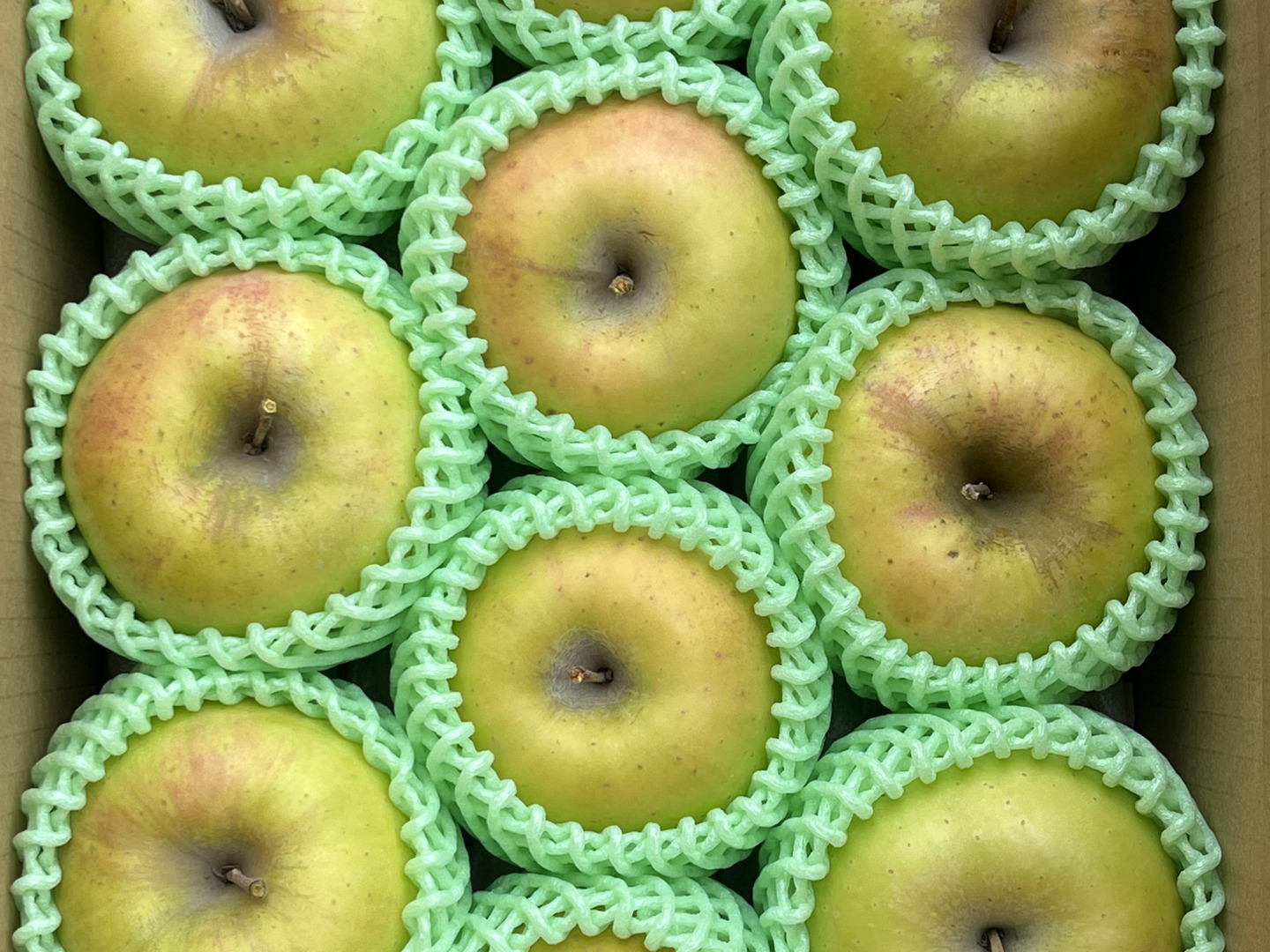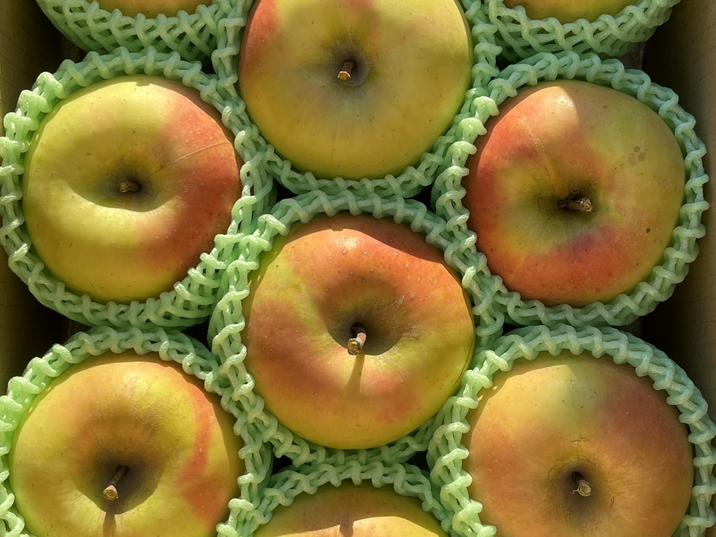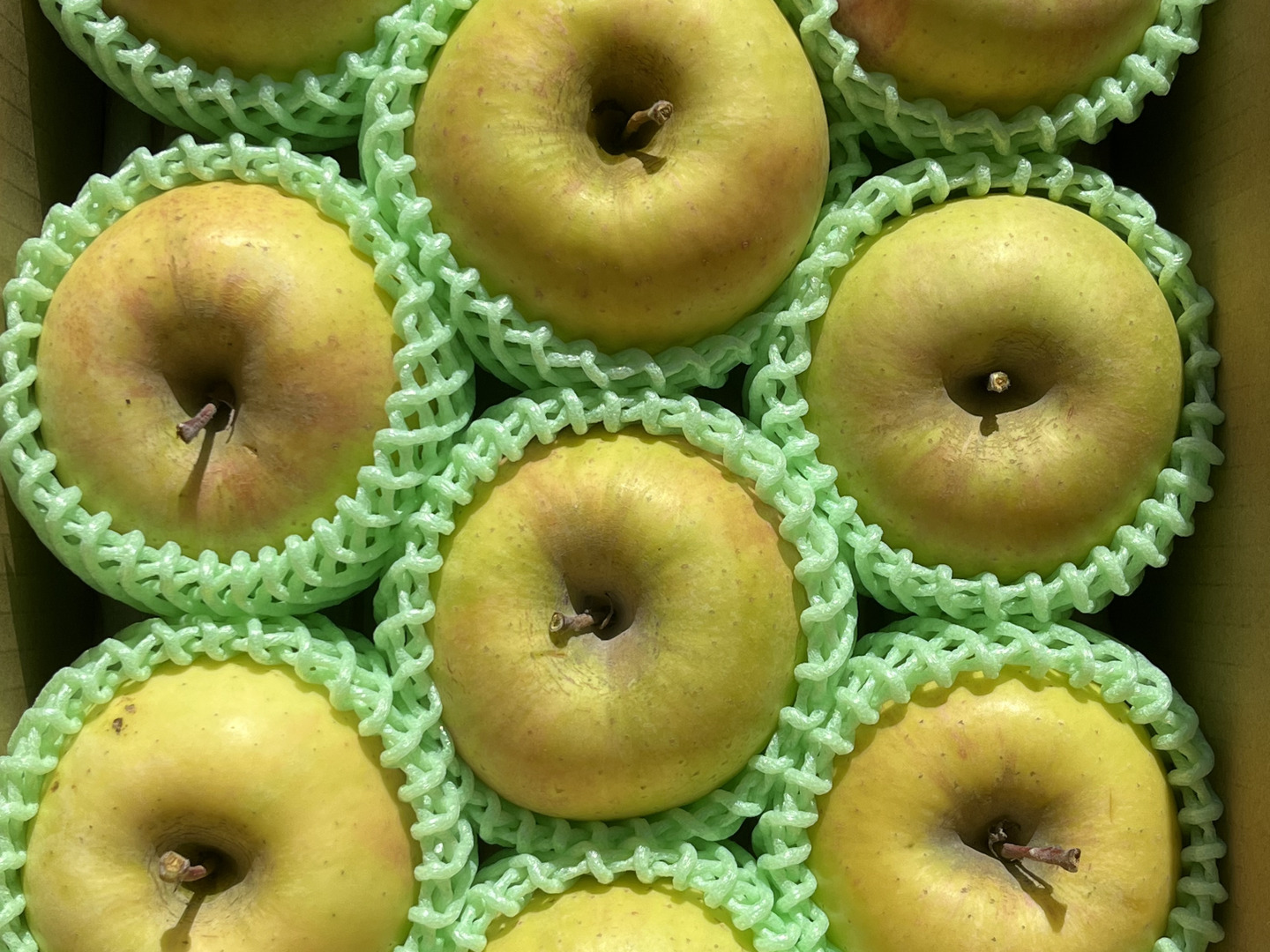 黄色のりんごですが、日光が当たる加減によって、果皮の一部がほんのりと赤く着色しているものもあり、表面の半分が赤く染まっているものもあります。