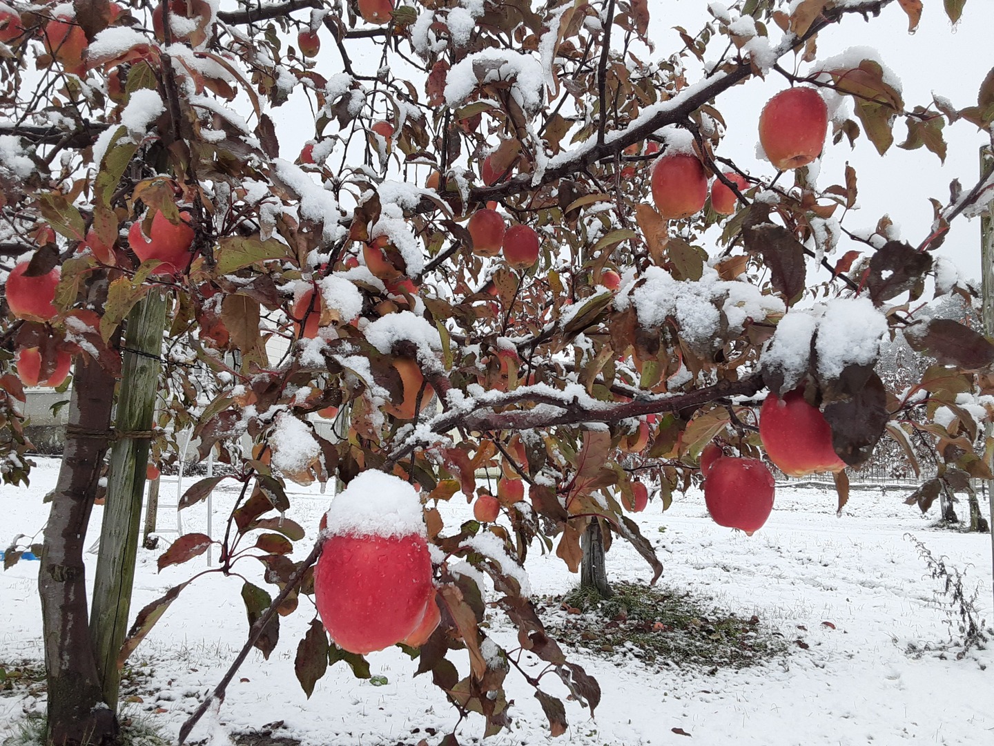②:豪雪に乗られても落ちなかった忍耐強いりんごを3個
