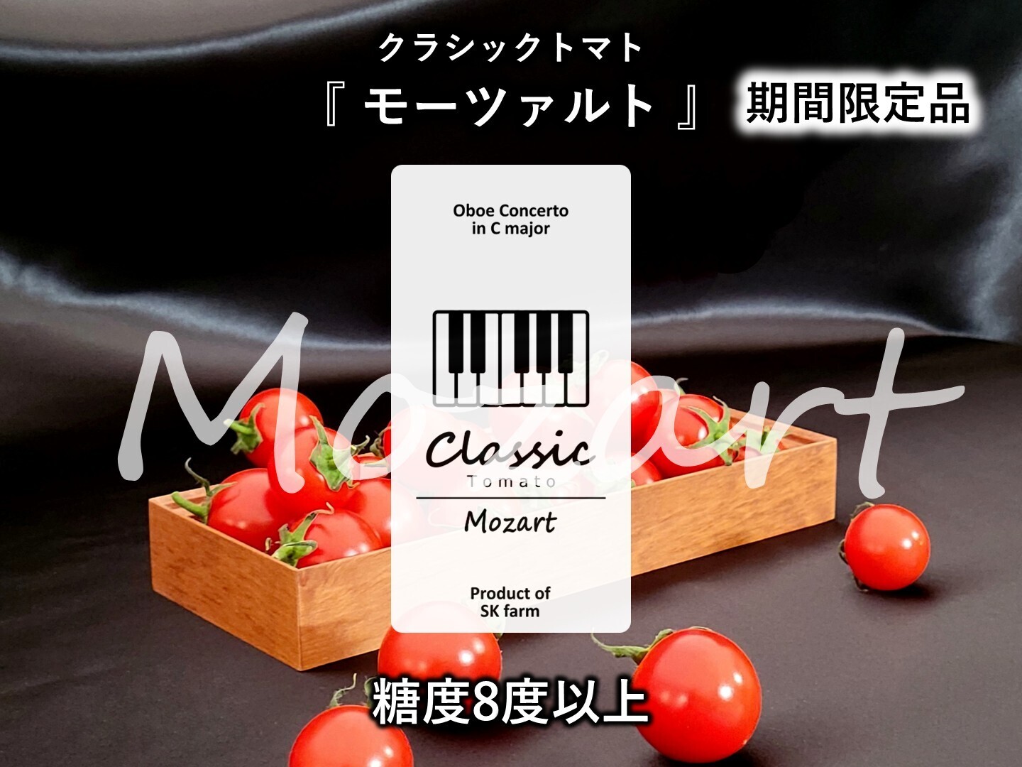 糖度は8度以上の期間限定品です。収穫開始~約3週間に限られジューシーで酸味がほぼ無くフレッシュな甘さがあります。ピンポン玉程の大粒で皮が柔らかく爽やかな甘みがあり、酸味の少ない味が好みの方などにご好評です。モーツァルトの様に朗らかで軽やかなミニトマトです。