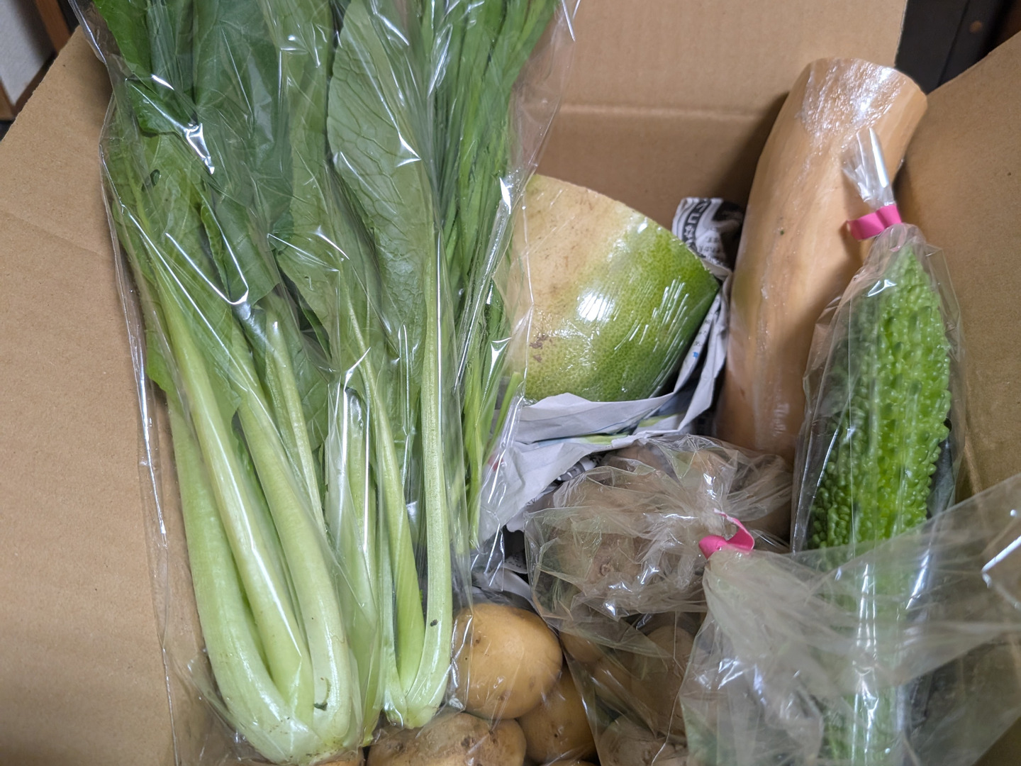 毎日の出荷作業でどうしてもお野菜が余り、自家用でも消費きれないためおすそ分け。ダンボールにお野菜を9袋程入れます。