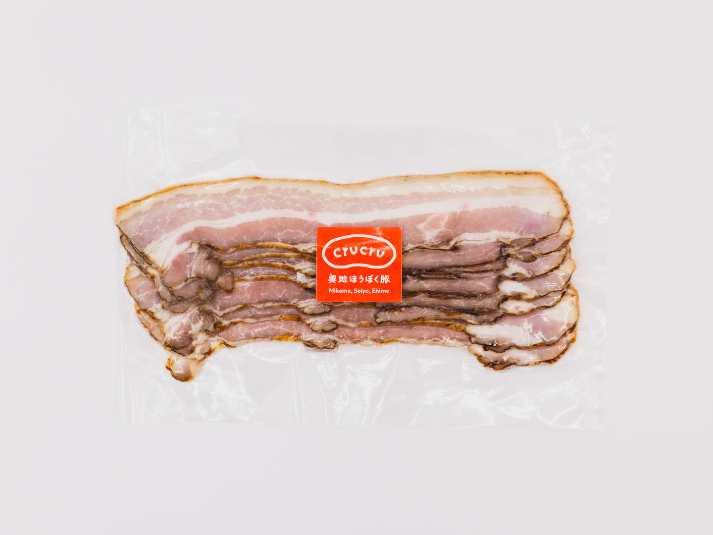 結着剤・発色剤・化学調味料を使用していない無添加のスライスベーコンです。豚バラを使用し、奥地ほうぼく豚の特徴である脂身の甘さを感じていただけます。定番のベーコンは軽く炙って、朝食を彩ったり、夜の晩酌のお供にぴったりです。ぜひお楽しみください。