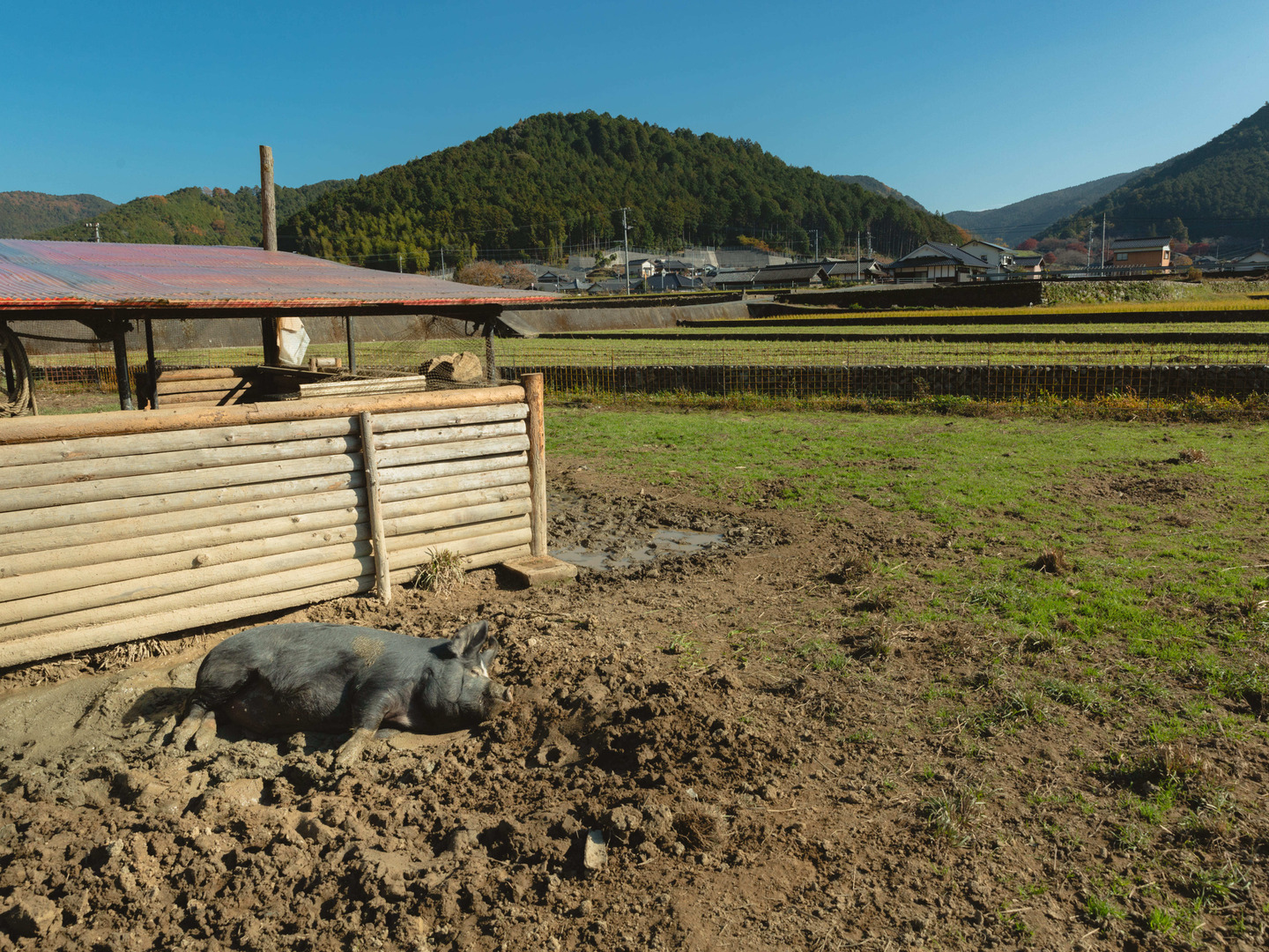 西予市・三瓶地区の耕作放棄地でのびのび育った「奥地ほうぼく豚」。