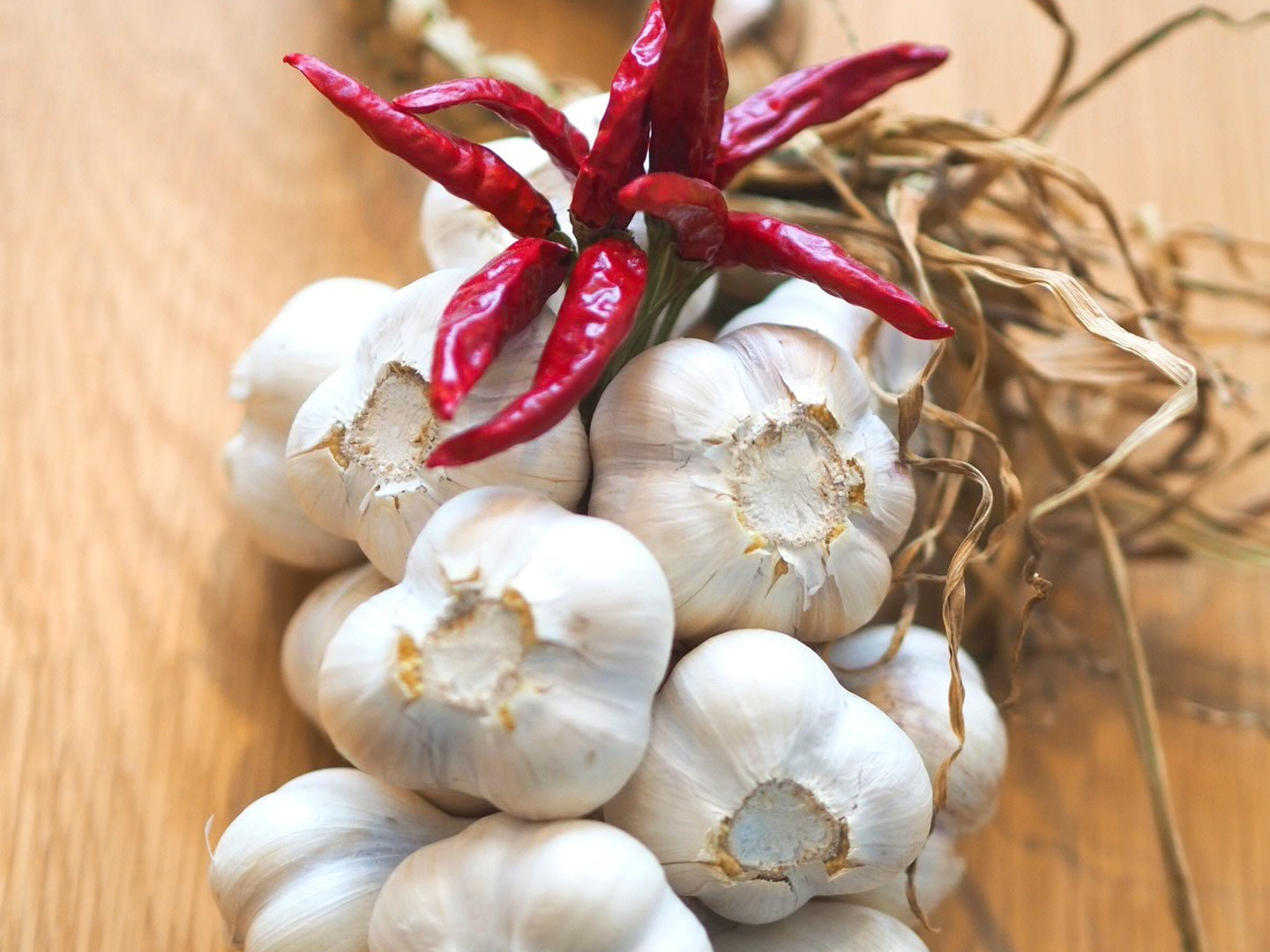 欧米では保存と魔よけの意味合いから、ガーリックブレイドをキッチンや玄関先につるしておく習慣があったようです。