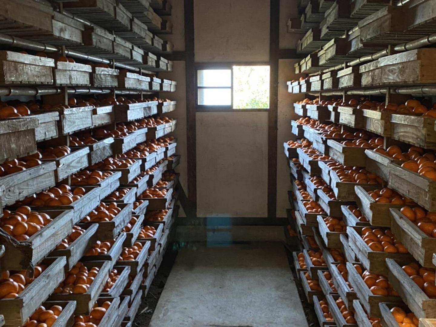 12月に収穫してから約2ヶ月間貯蔵庫で温度と湿度を一定に保ちながら貯蔵することによってその風味が増し、余計な酸が抜け、深い甘みを蓄えて極上の逸品へと生まれ変わります。