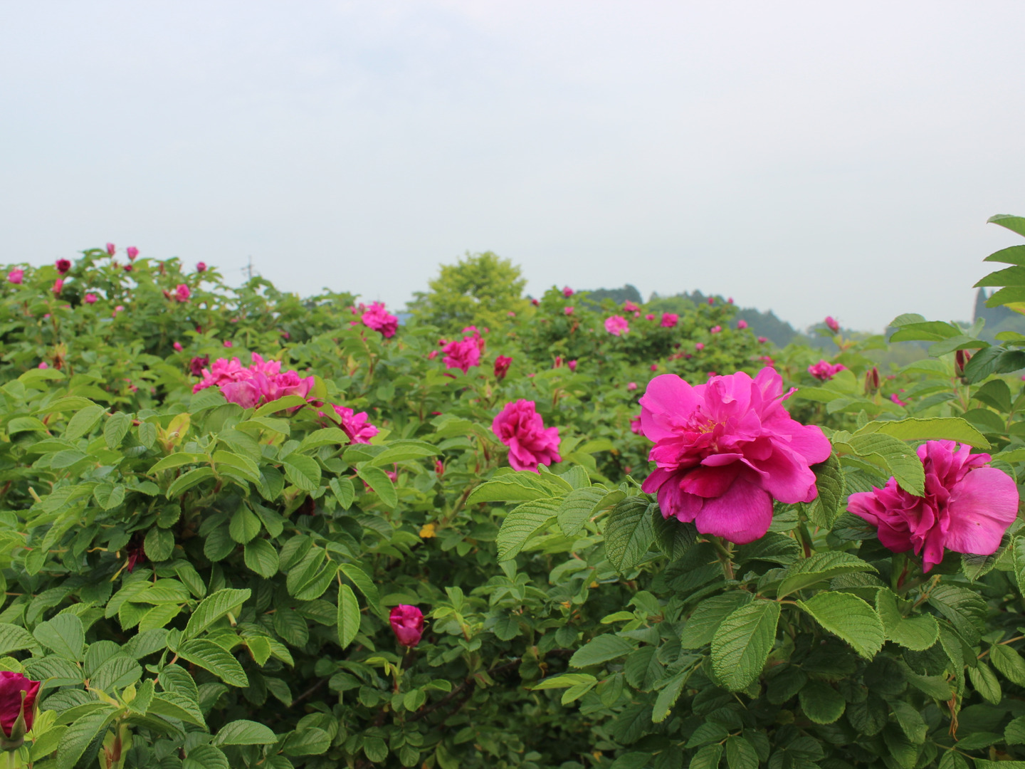日本に自生する原種は、ジャパニーズローズとも言われ、鳥取県西伯郡大山町がハマナス自生南限地帯とされています。毎年初夏になると濃ピンク色の可憐な花が咲きみだれ、素晴らしい香りとともに私たちの心を癒してくれます。現在は、白と濃ピンク、一重と八重、四種類のハマナスを保有しており、一重はローズヒップ用として、八重は加工用として栽培しています。