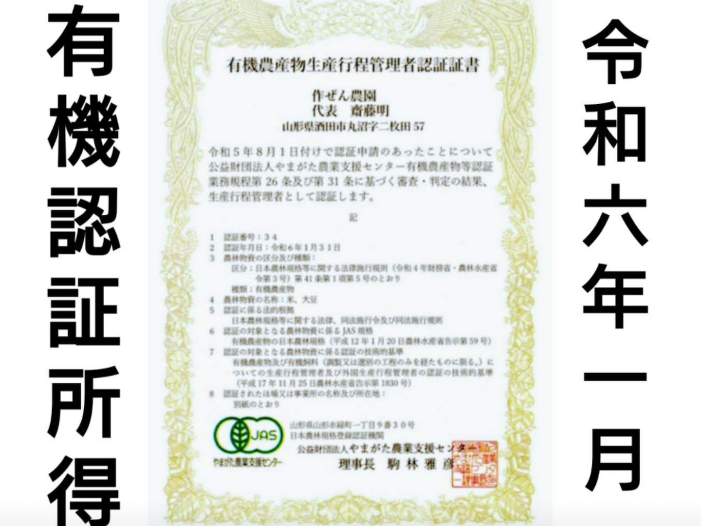 昨年3月までは有機米集荷団体で団体認証で有機JAS認証所得していましたが、今年1月から個人で有機JAS認証所得しました。
