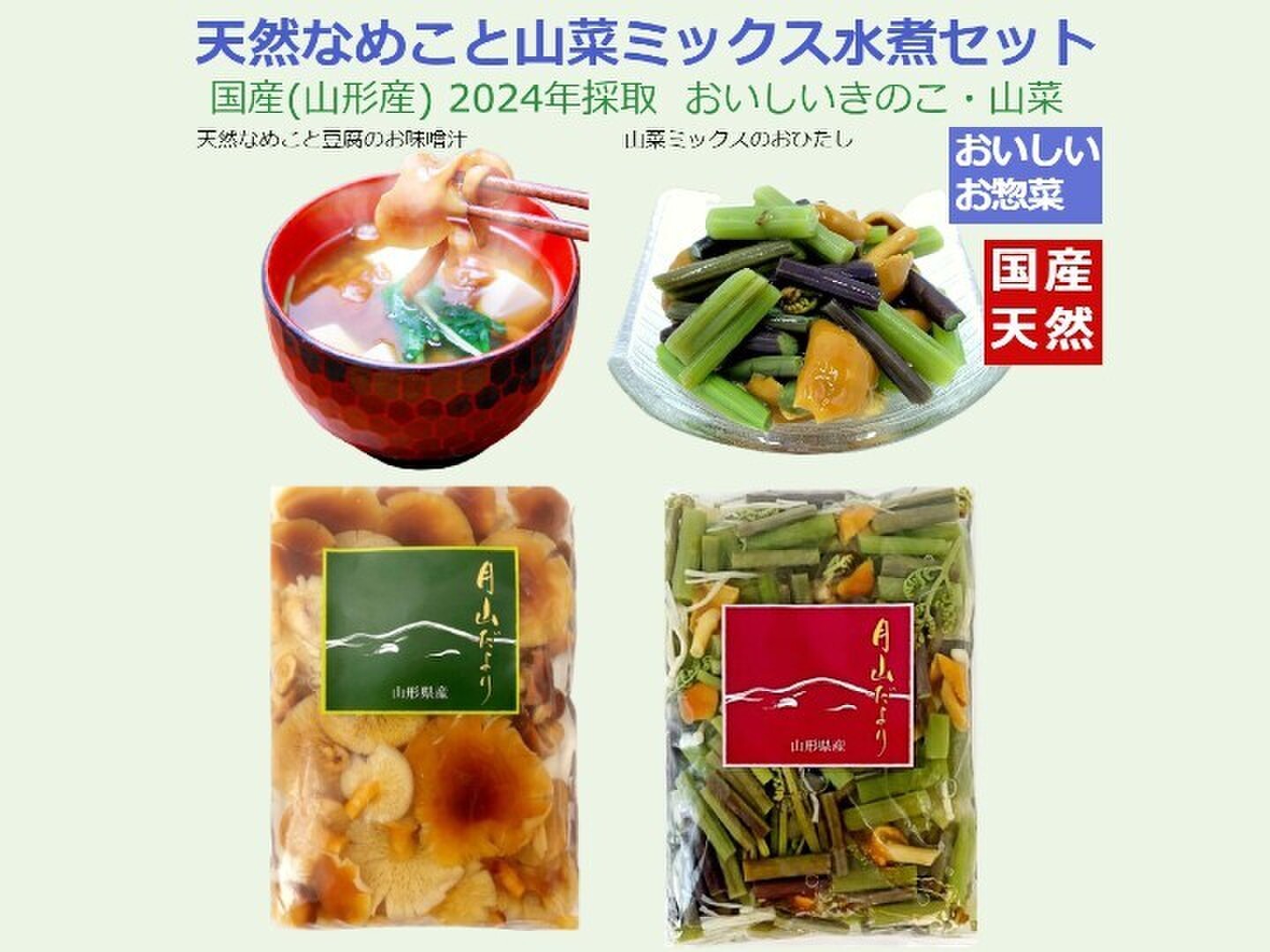 国産天然なめこ+山菜ミックス水煮 各1袋 山形産