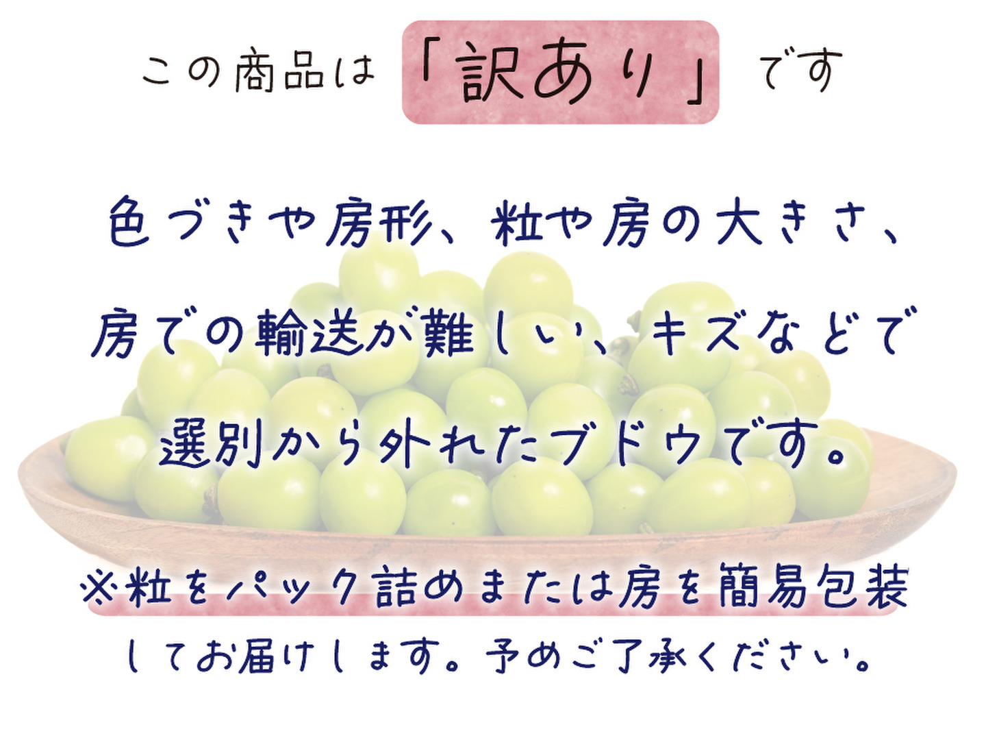 訳ありの理由は、①房の形が悪い、②粒の大きさが小さい、③房の大きさが小さい、④色付きが悪い、⑤粒の表面に傷が付いている、などです。そのため粒にしてパックに入っていることがあります。