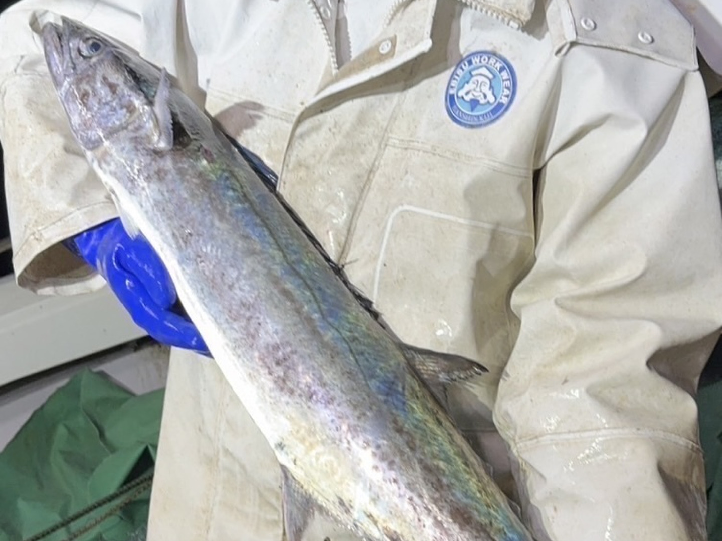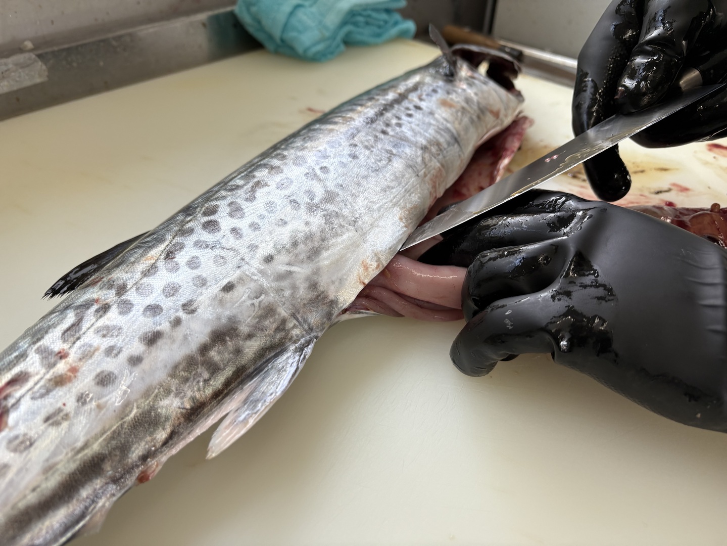 獲れたての「天然サワラ」を網から丁寧に外した後、船上にて血抜きを行い、直ぐに潮氷締め!