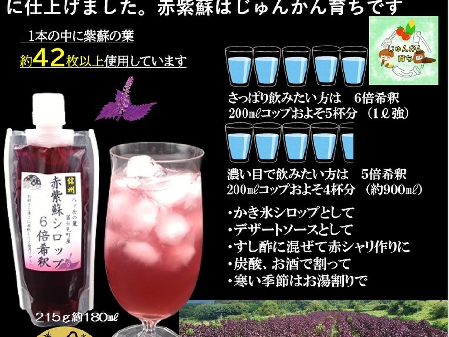 | 内容 | 赤紫蘇シロップ6倍希釈215g×1個 赤紫蘇寒天ゼリー飲料150㎖×1個 赤紫蘇ジュース×1個 赤紫蘇ジュレ×1個 | ||||||