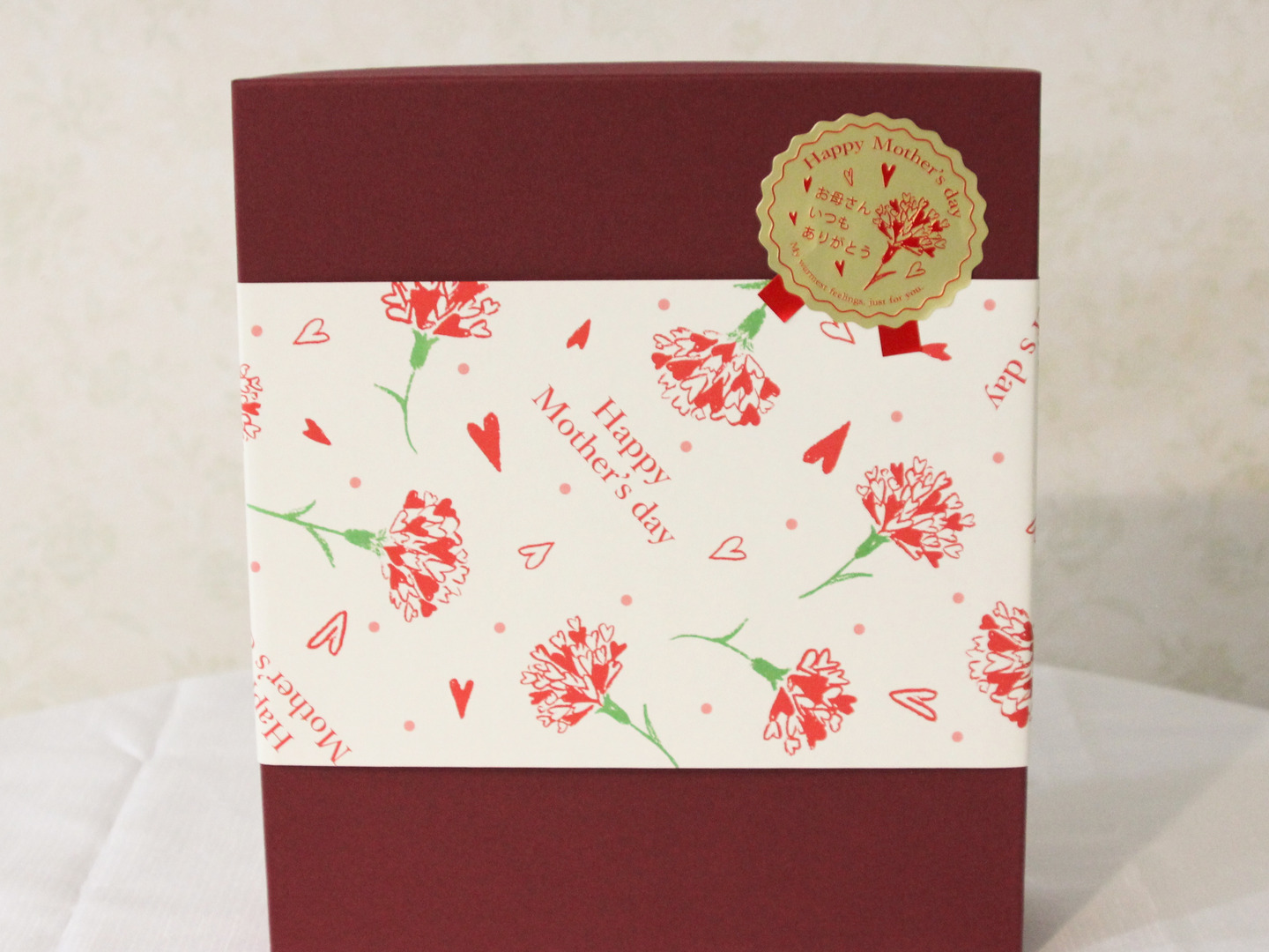 ラッピングは赤のギフト箱にお入れして母の日用のカーネーションの掛け紙をし
