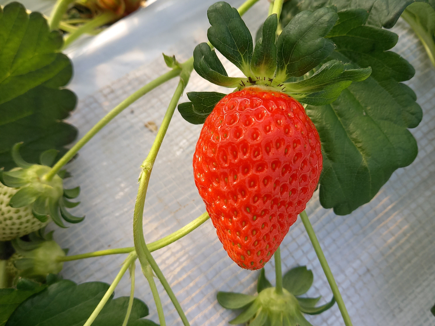 甘味くて旨味い苺を育てるためにオリジナルの「ワイン堆肥」を使用して「活きた畑」作りからしっかりと取り組んでいます。「ワイン堆肥」とは私が25年以上の生産キャリアで培った知識、技術、人の輪により出来た独自の堆肥です。活きた畑を育てる事により土に包容力が生まれ過剰な水や肥料と加温が不要となります。そしてワイナリーから出るワインの搾りかすや米農家から出るもみ殻など有機ゴミから苺を育てる事により環境に優しい資源の循環が可能で、「農業の本質でもある再生」にも取り組み持続的なサステナブル農業が営めます。勿論、自農園から出る有機ゴミは全てもう一度自農園の畑に戻り堆肥として再利用されています。「美味しいだけではない苺」を栽培する為には大変な事も多いのですが、「人にも環境にも未来にも優しい農家」を目指して生産をしていきます。また、「活きた畑」の中ではミミズや土着菌達が多く活躍できる「生物多様性」にも取り組んで、微生物も農家と一緒に生産のお手伝いをしてくれています。